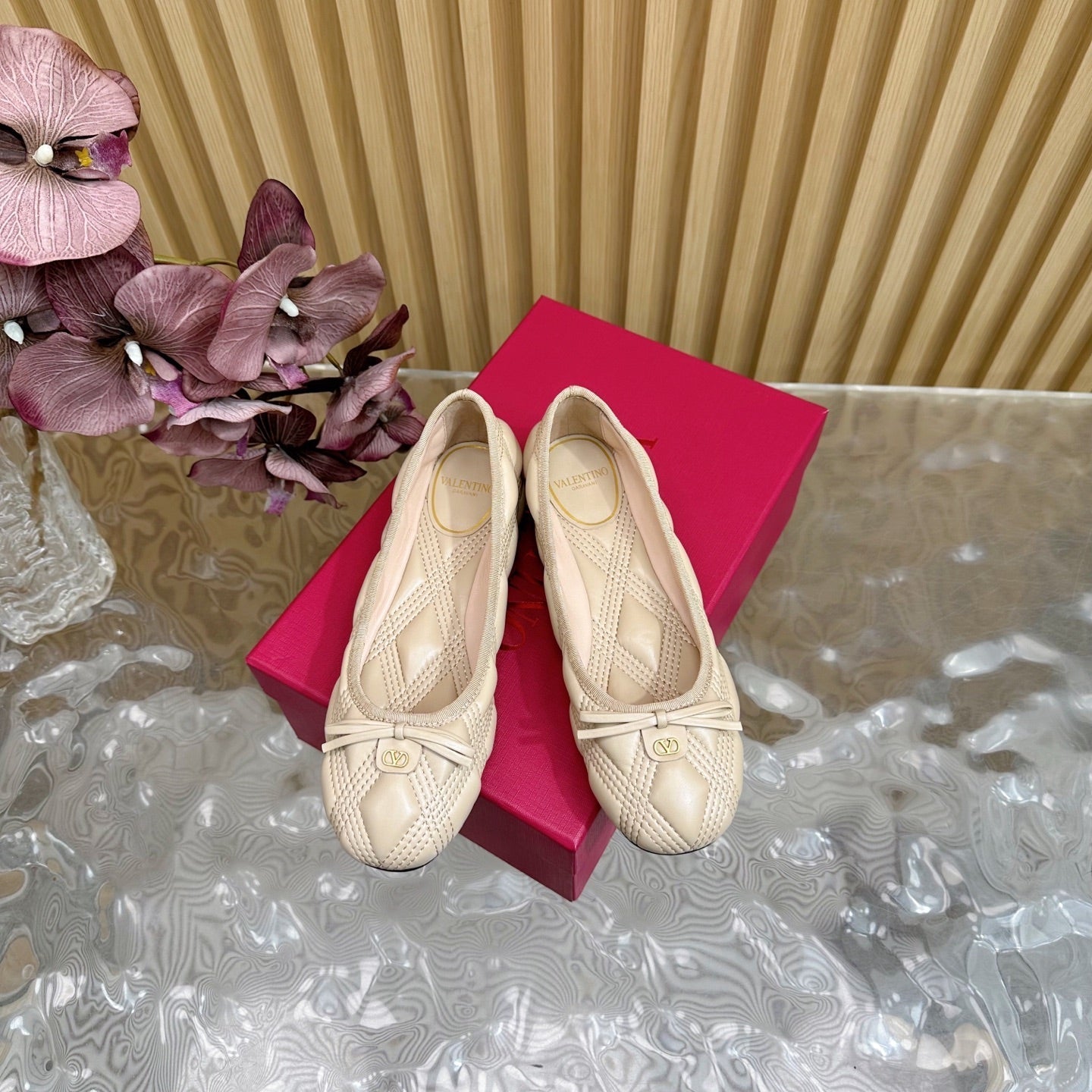 VT 2025 Quilted Leather Bow Ballerina Flats Nude Sheepskin 286492