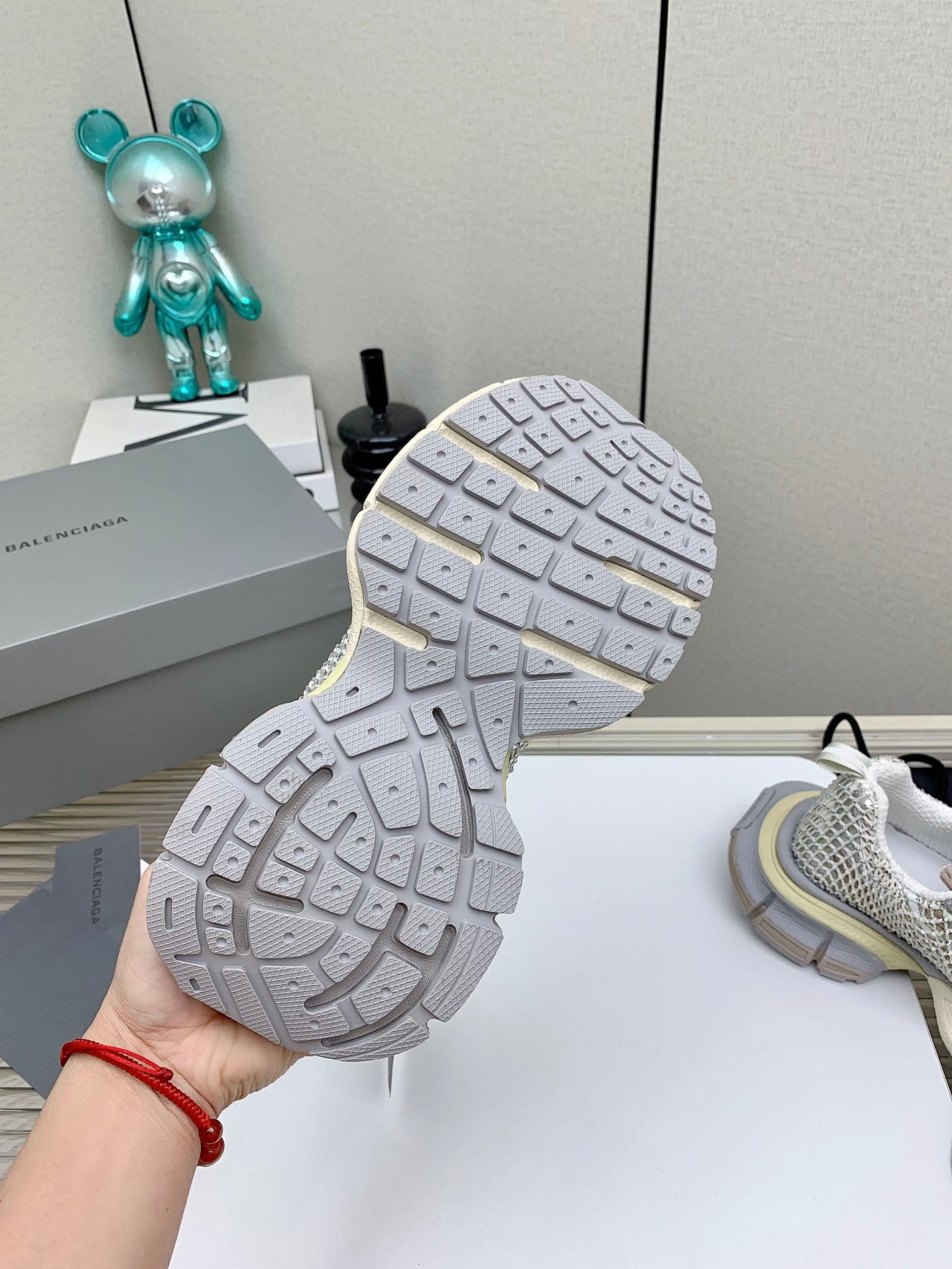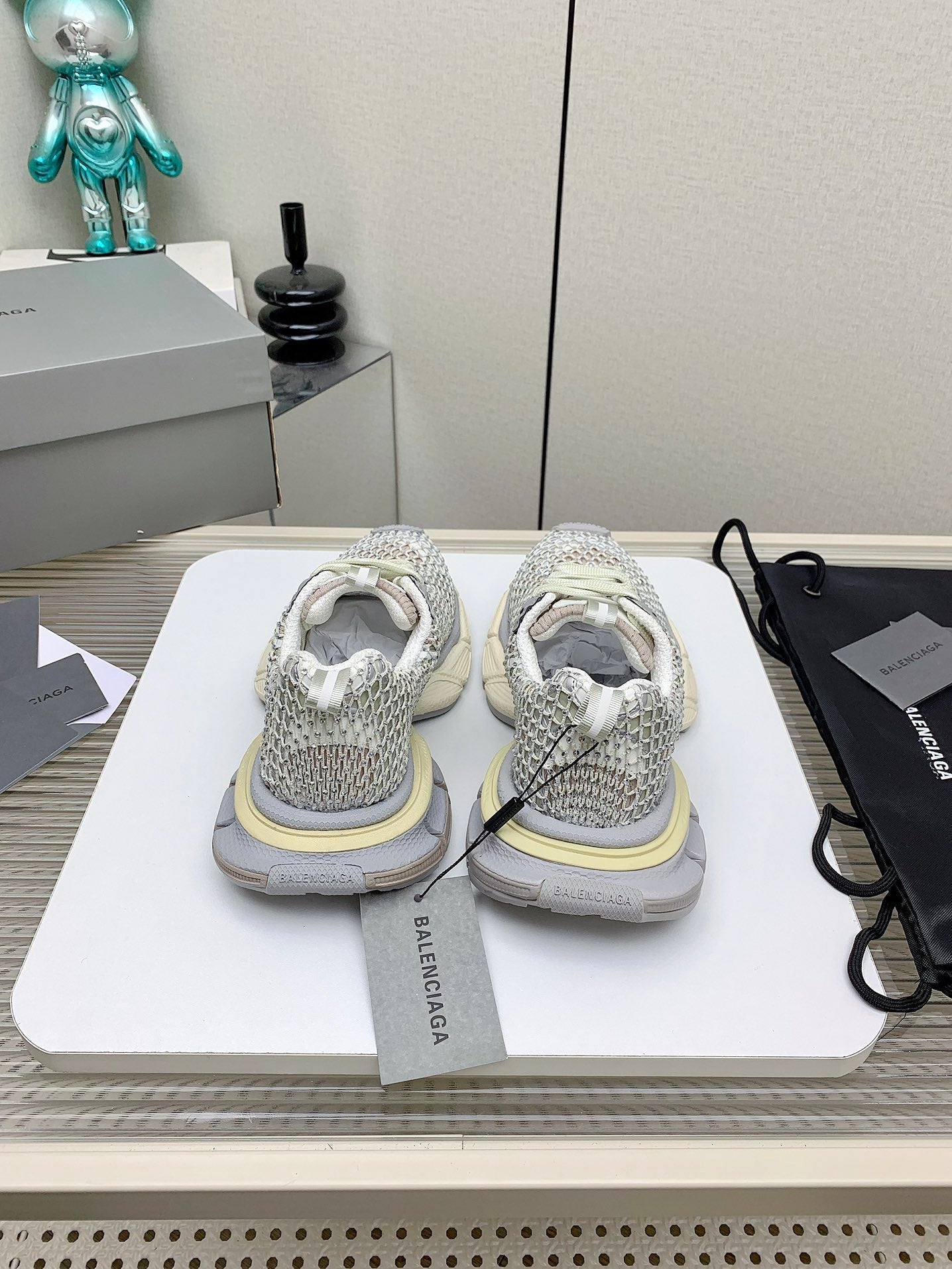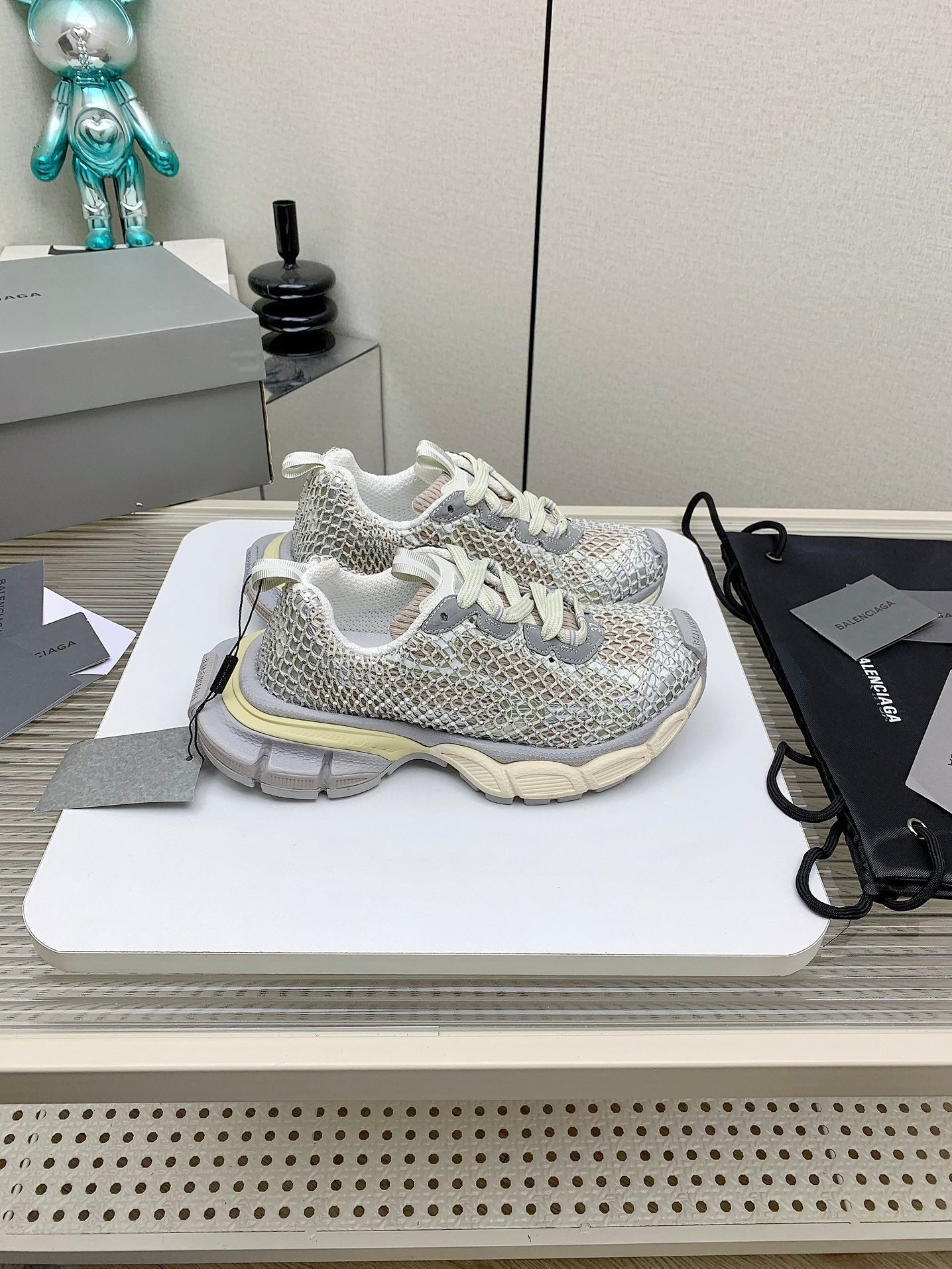 XL FISHNET SNEAKER IN GRAY AND BEIGE MESH, POLYURETHANE, POLYESTER WITH RHINESTONES