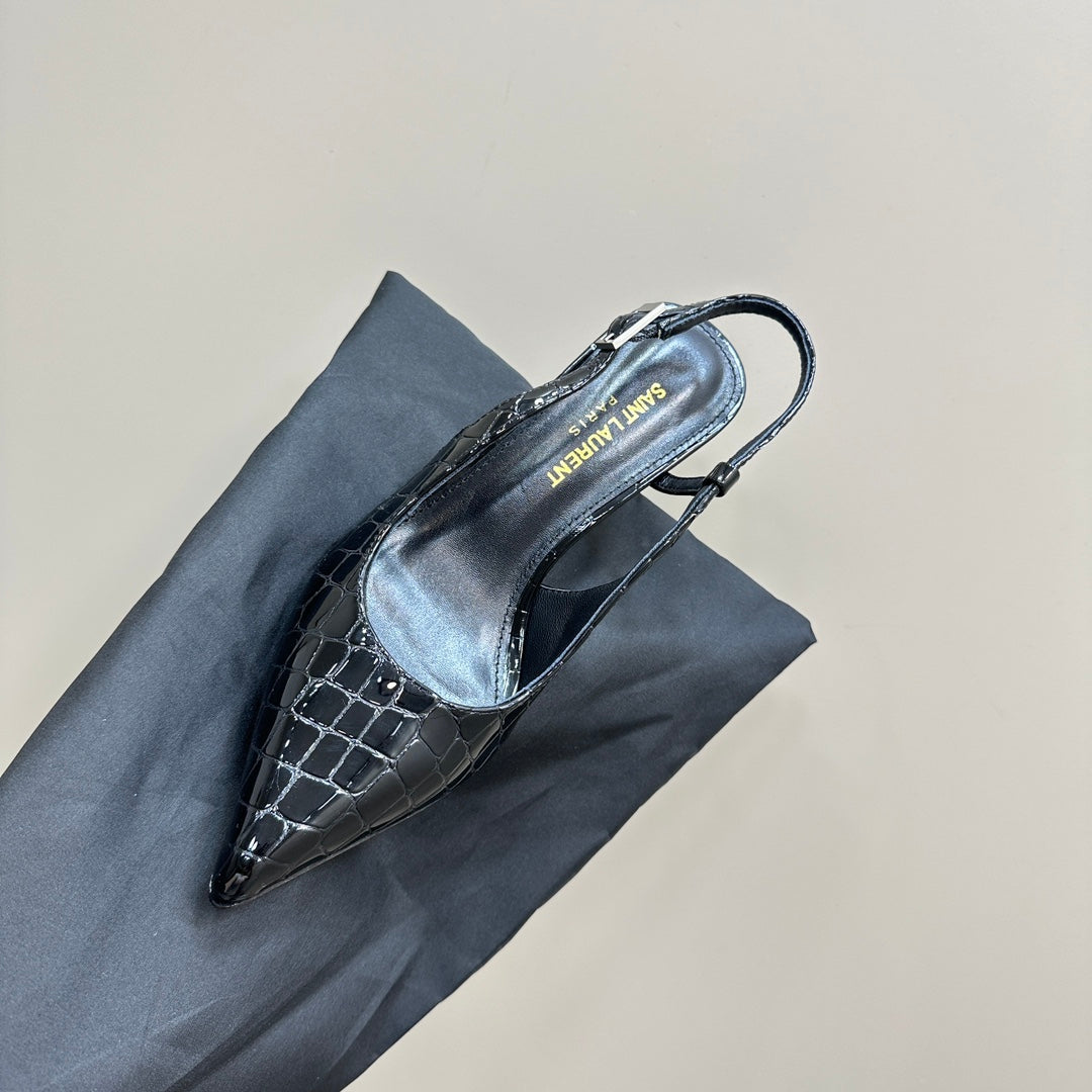 SL TRAPEZE CROCODILE MOTIF SLINGBACK PUMP BLACK CALFSKIN
