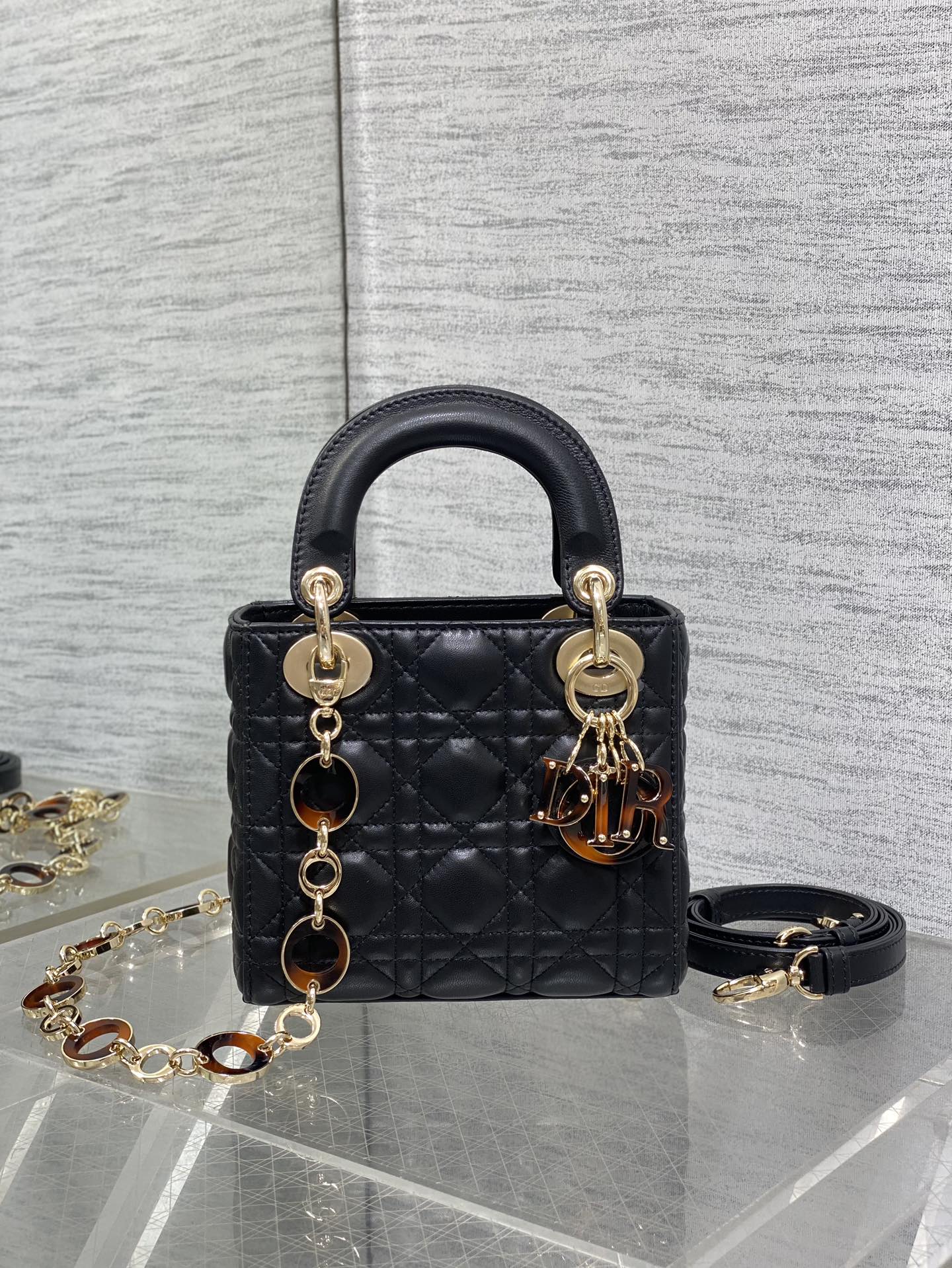CD Lady 17cm Black Lambskin Brown Charm