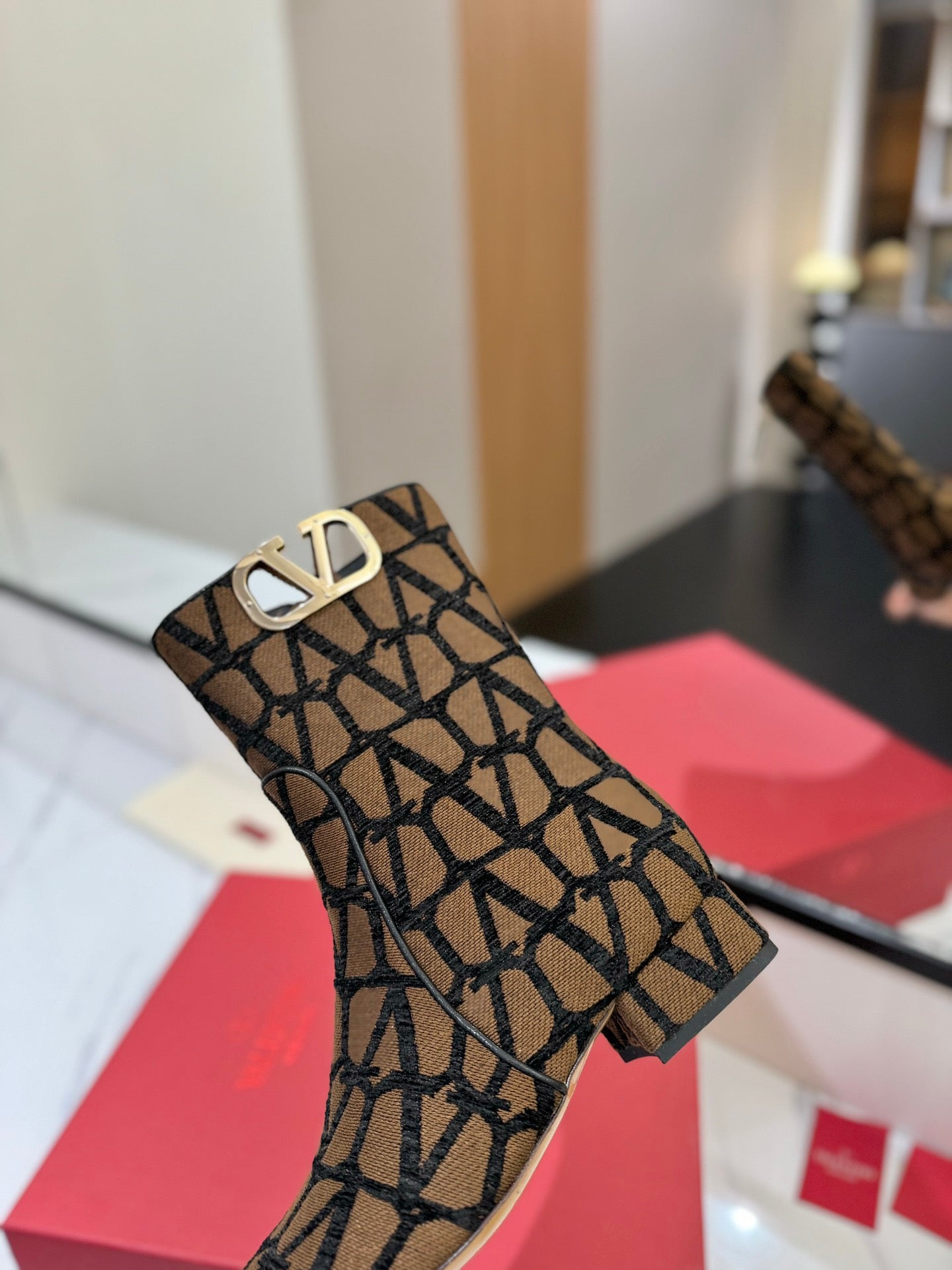 Valentino Garavani VLogo Tall Monogram Ankle Boots 30mm In Brown Mix Black Canvas Fabric 992798