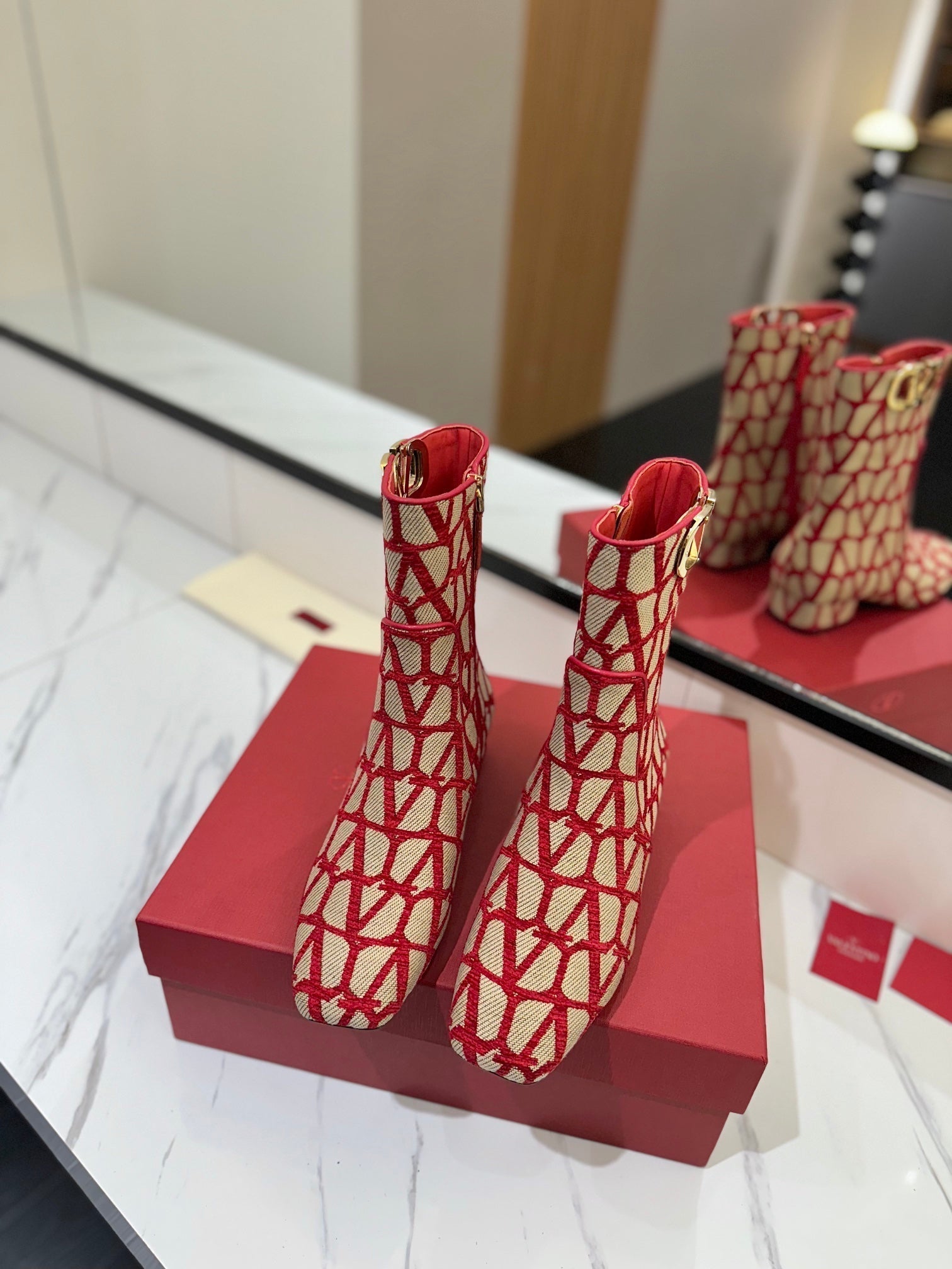 Valentino Garavani VLogo Tall Monogram Ankle Boots 30mm In Beige Mix Red Canvas Fabric 992802