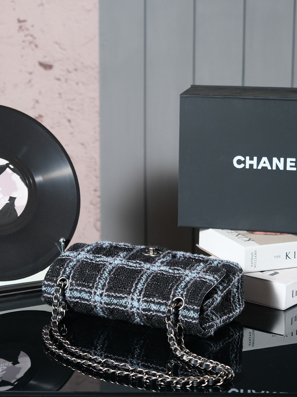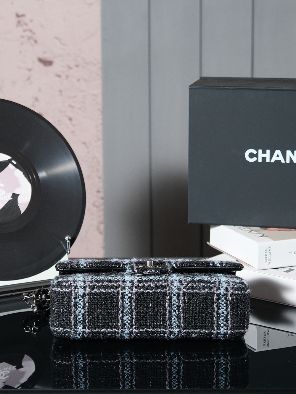24K Flap Bag 25.5cm Blue Black Stripe Tweed