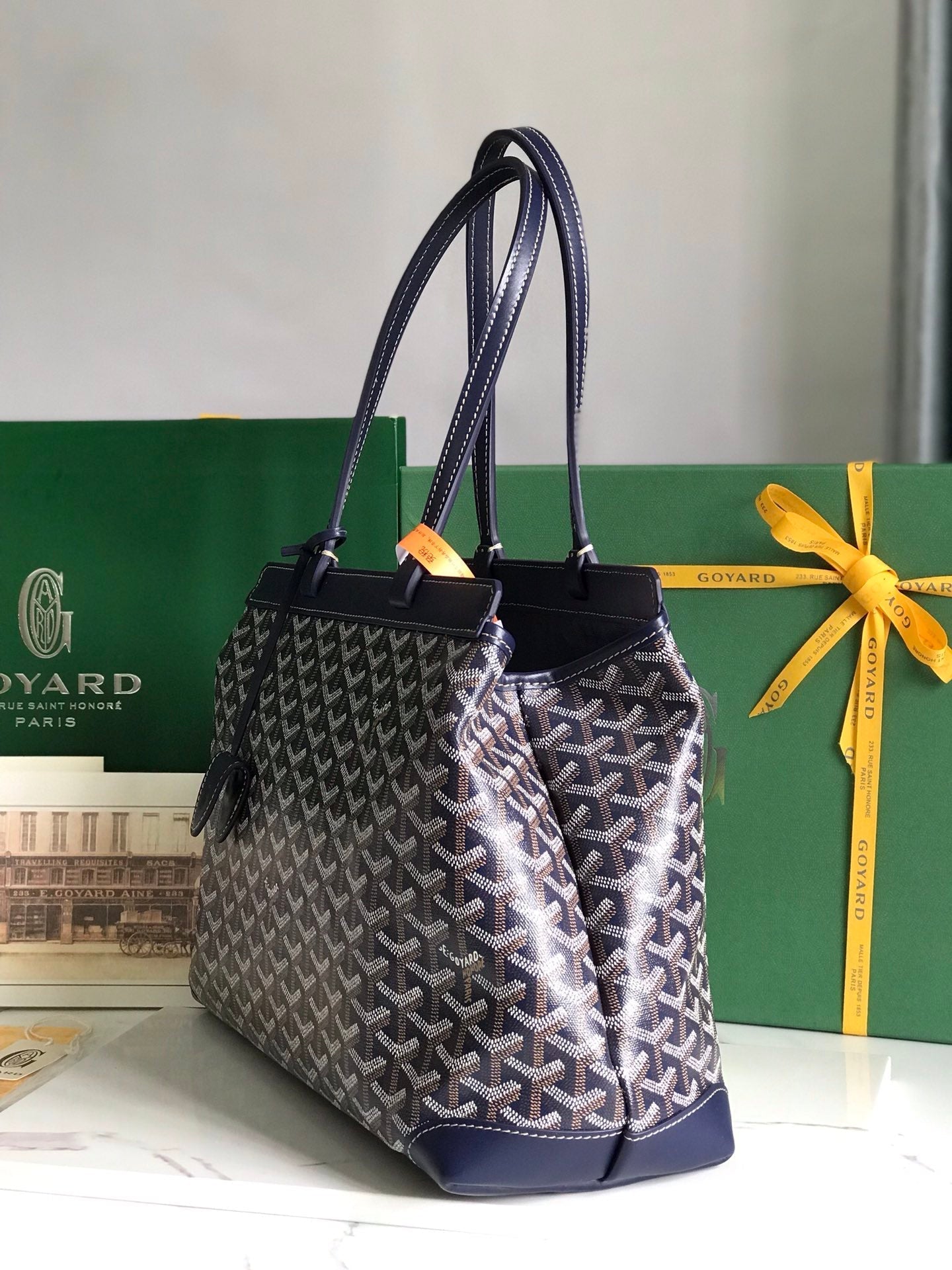 BELLECHASSE BIAUDE PM BAG 36 IN NAVY BLUE GOYARDINE CANVAS AND CALFSKIN TRIM