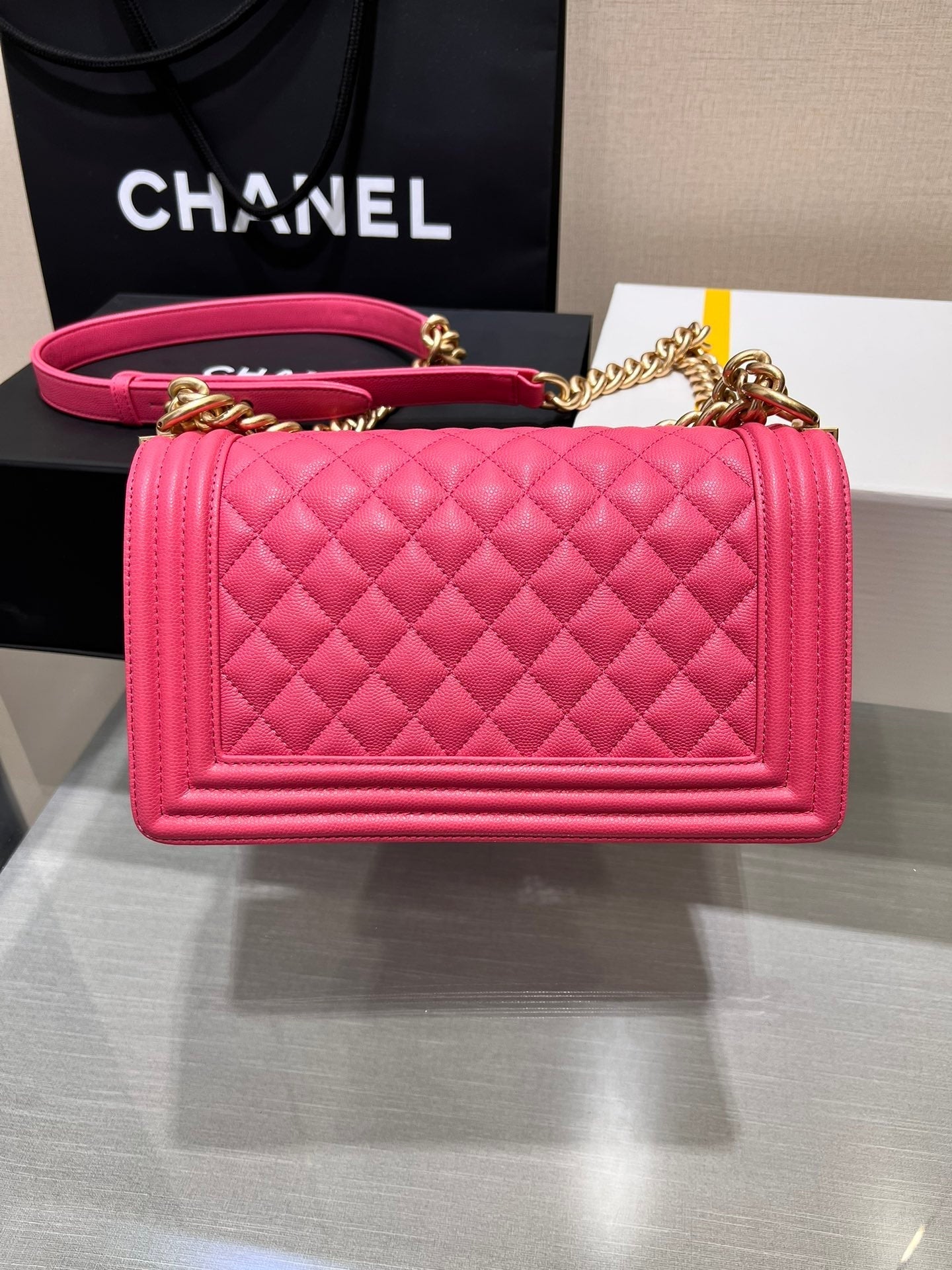 - The single chain strap drop of this bag is 51cm (20in) while the double strap drop is 30.5cm (12in)