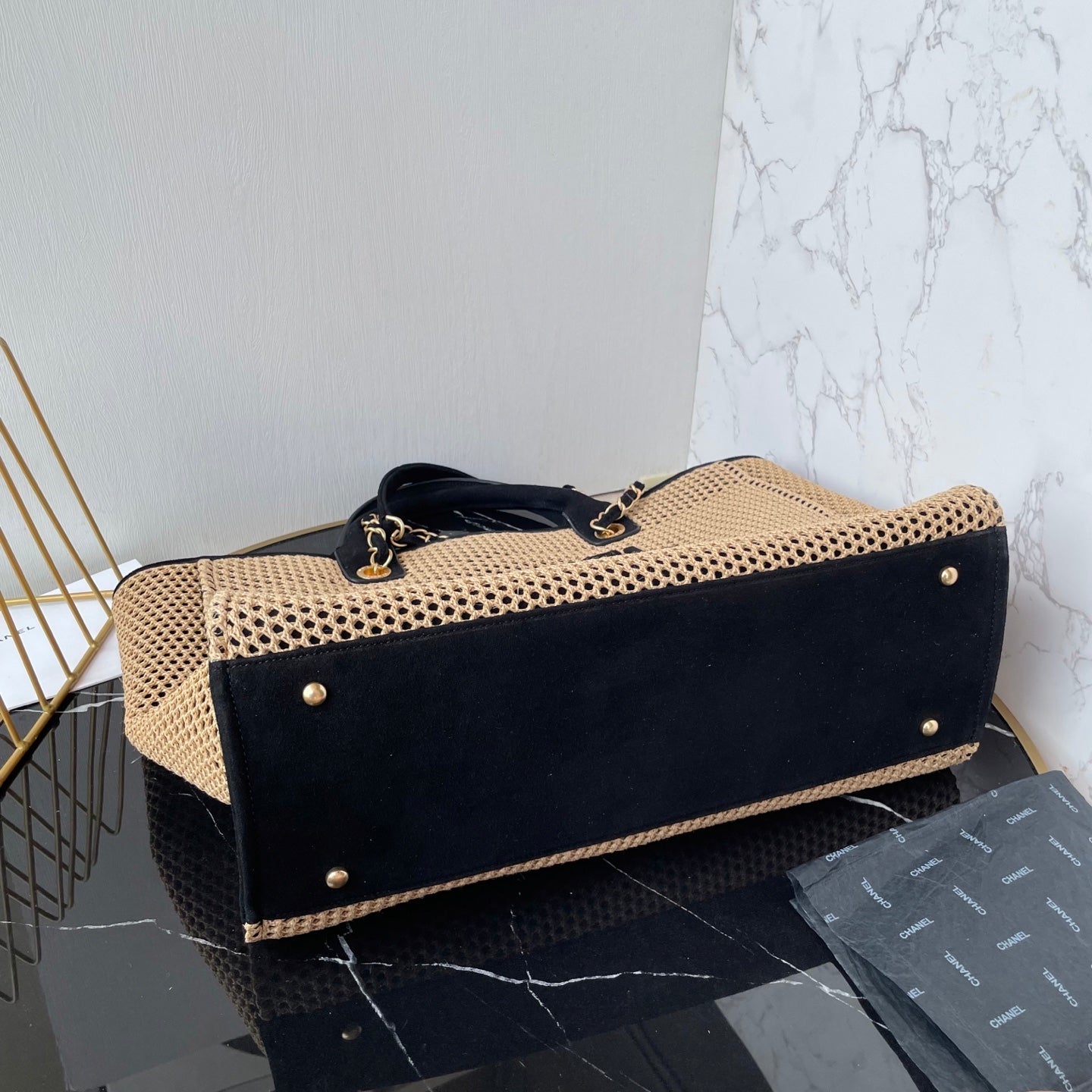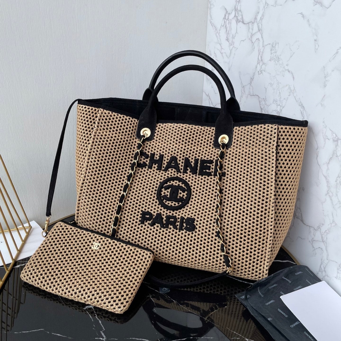 CC 25 Deauville Tote Bag 38cm Beige Black Crochet Suede