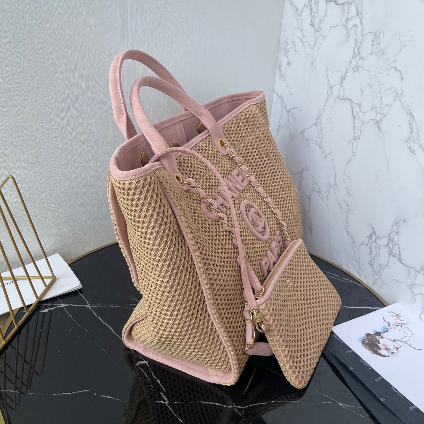 CC 25 Deauville Tote Bag 38cm Beige Pink Crochet Suede