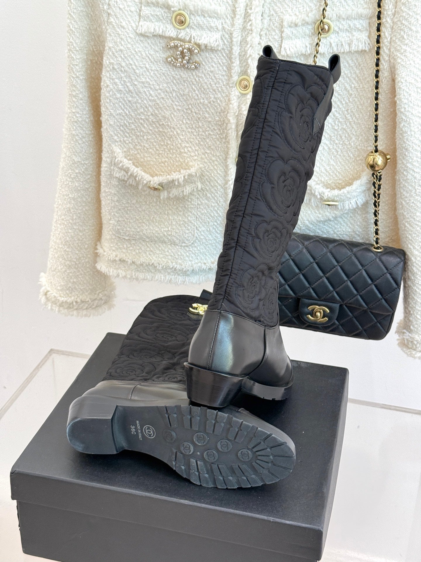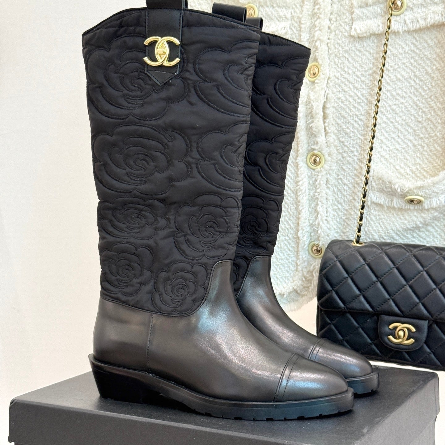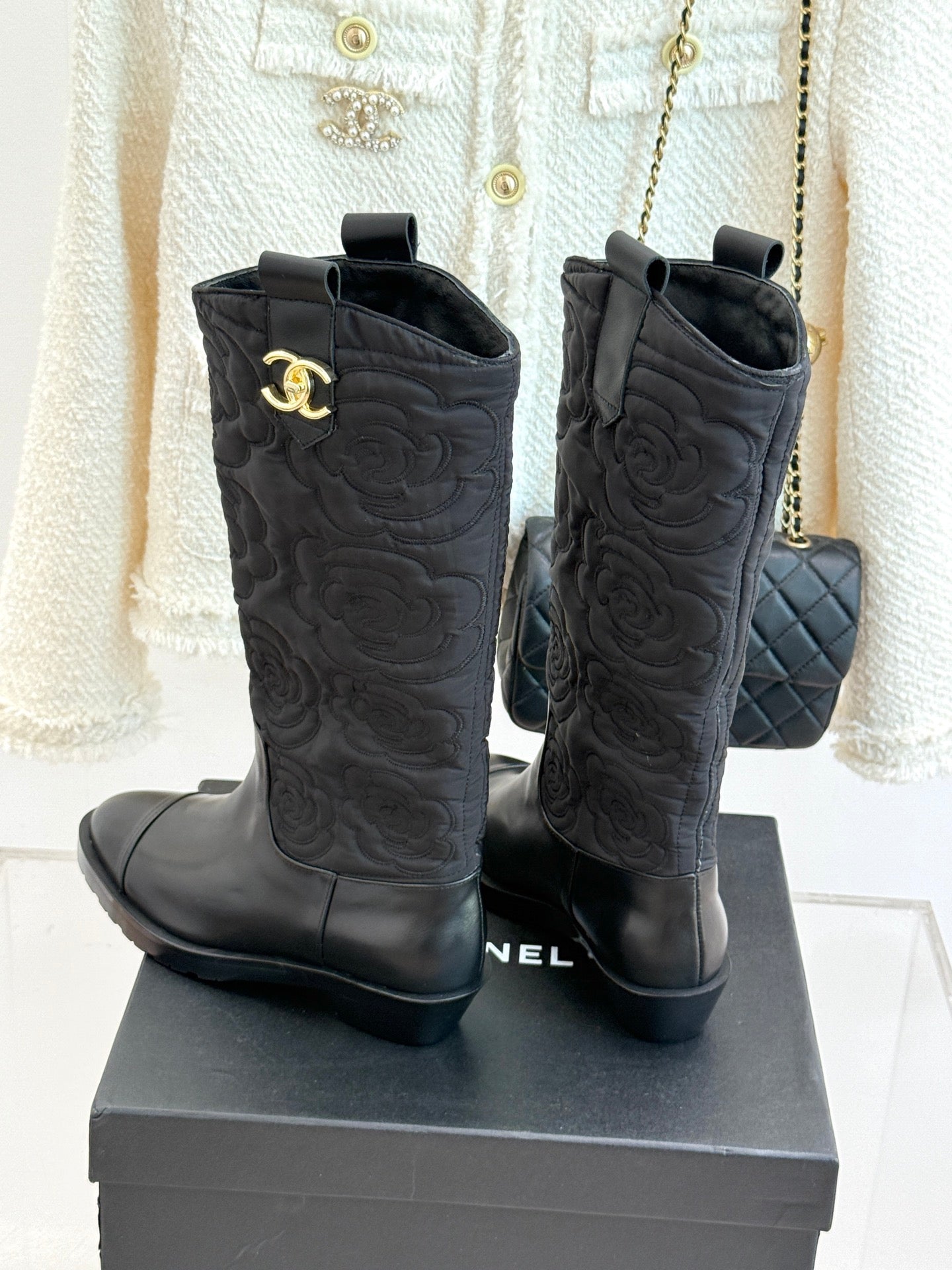 CC cowboy mid-calf boots black sheepskin denim fabric 511980