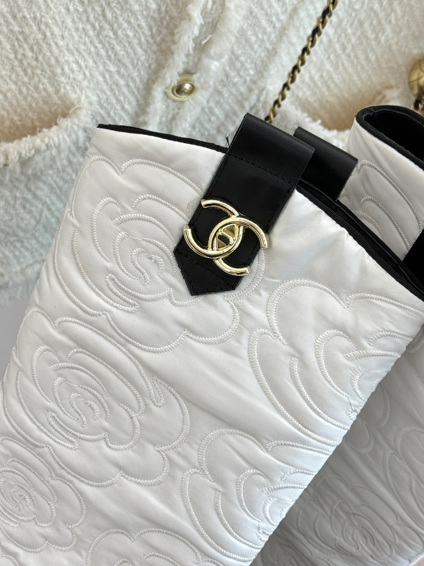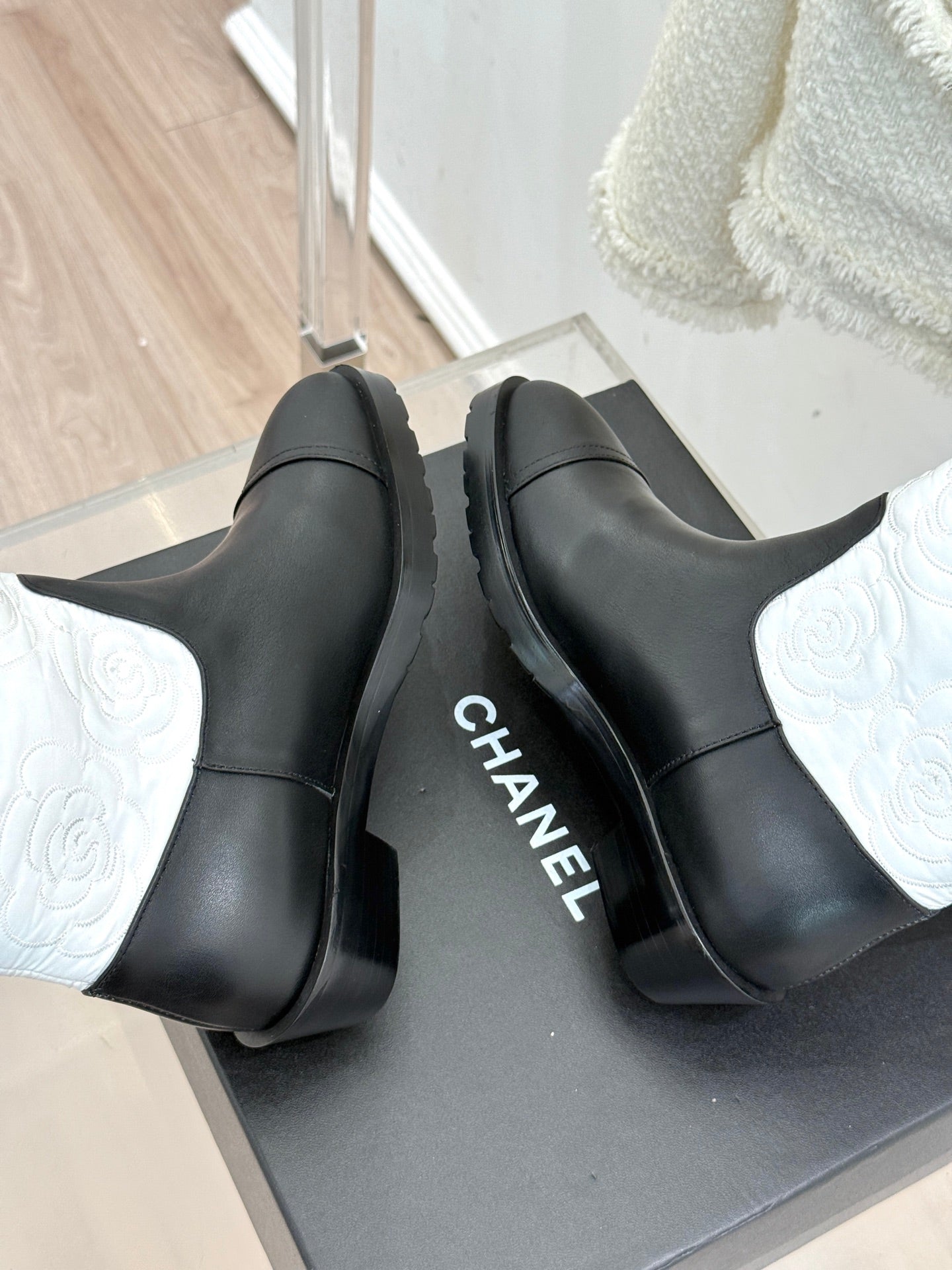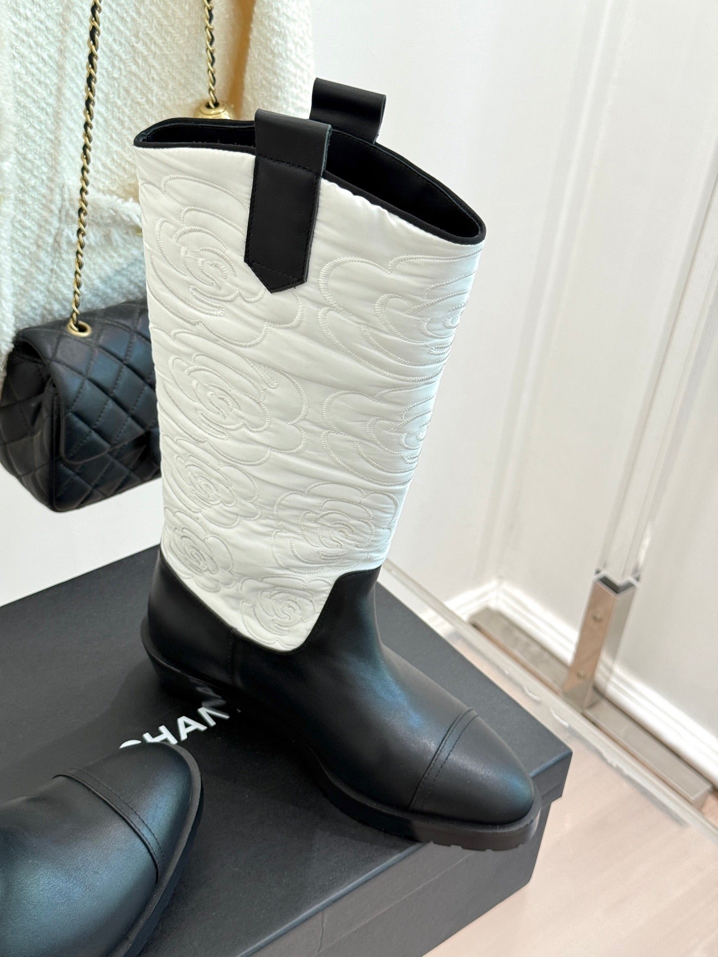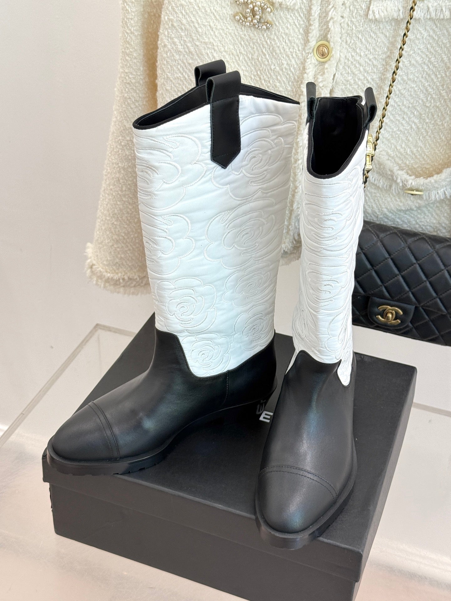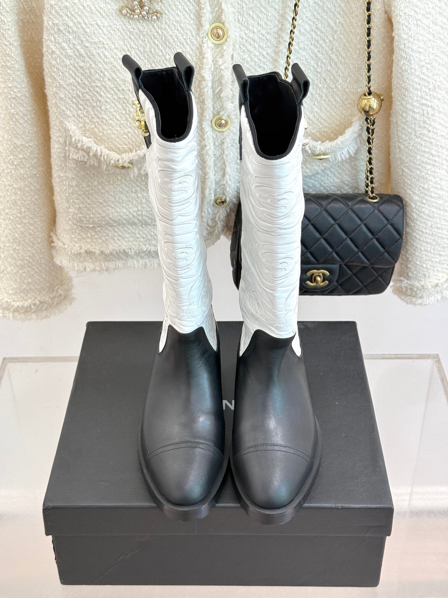 CC cowboy mid-calf boots black white sheepskin denim fabric 511981