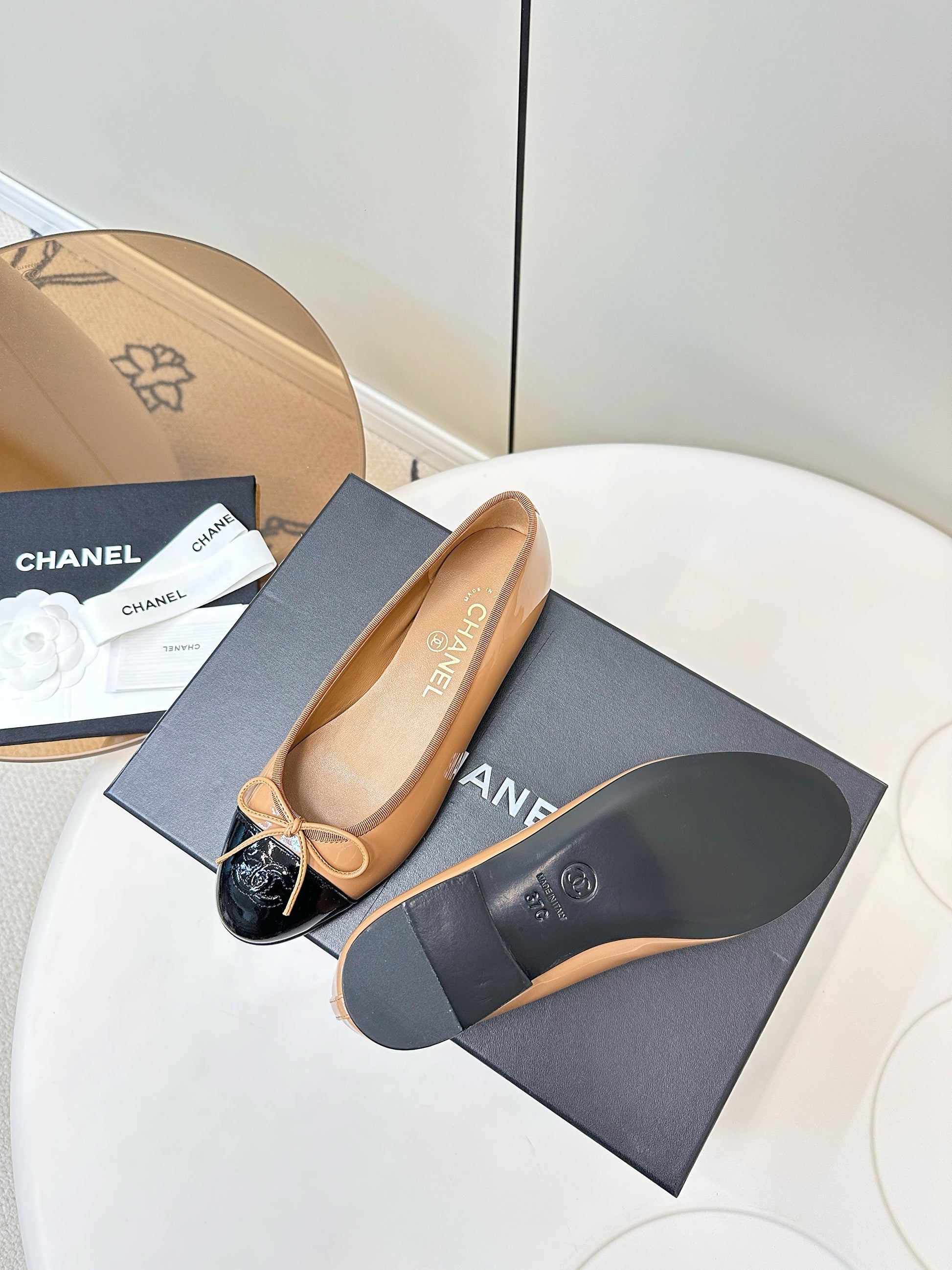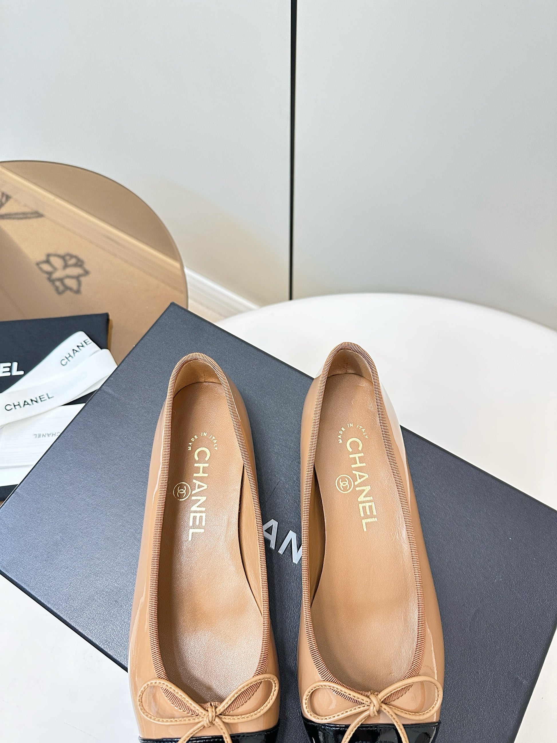 Chanel 25 Ballet Flat Tan Black Patent Leather 469255