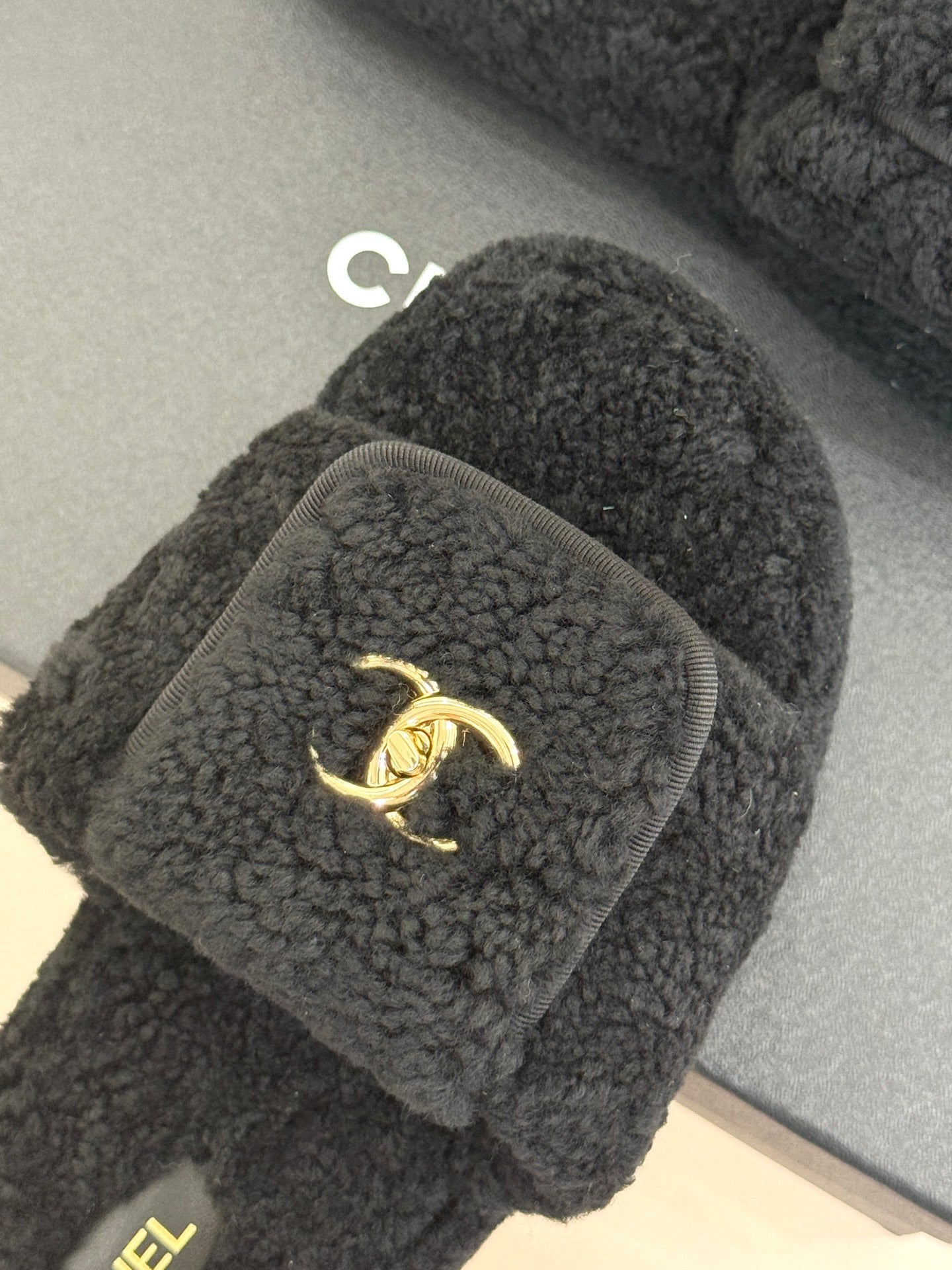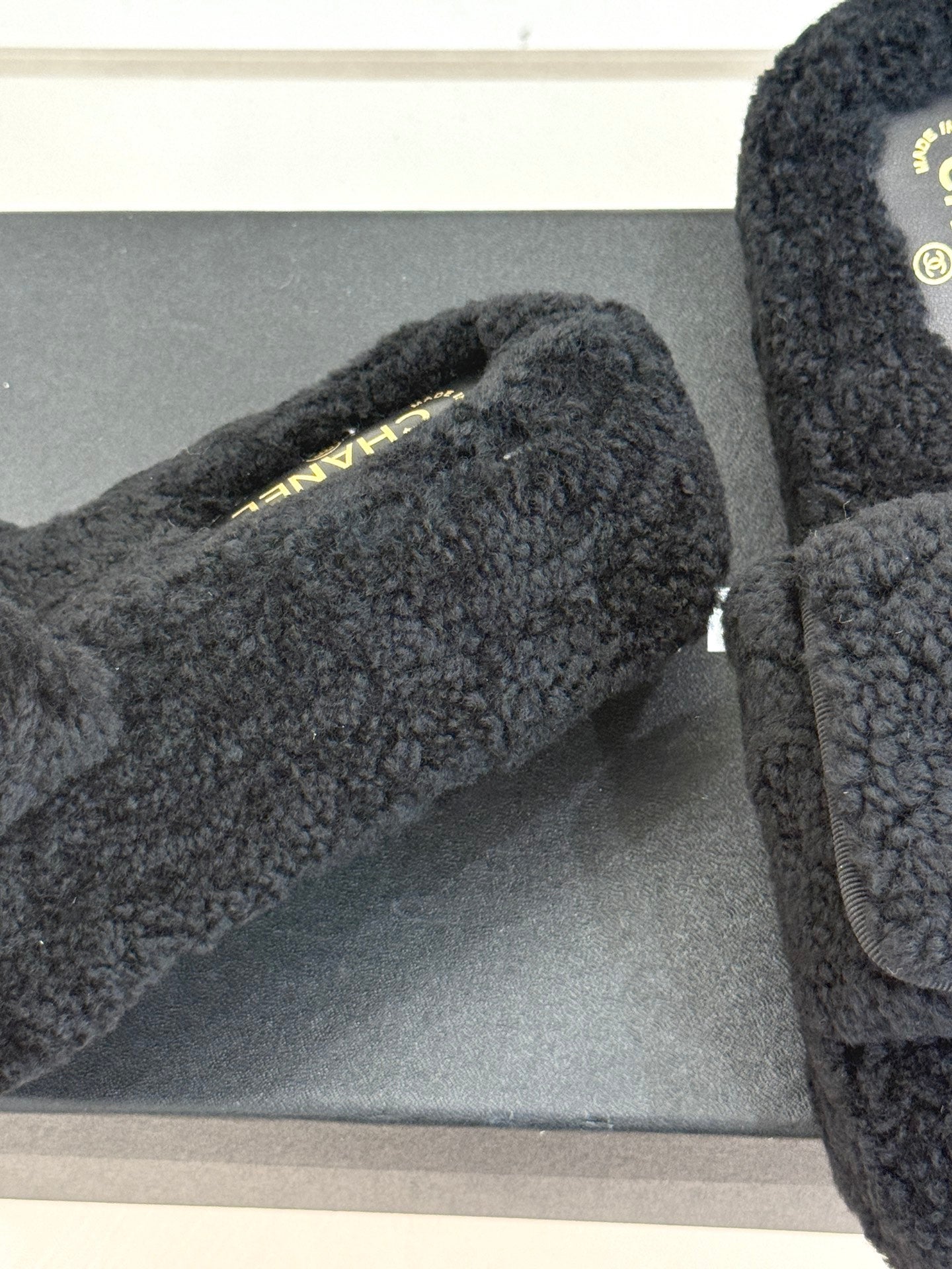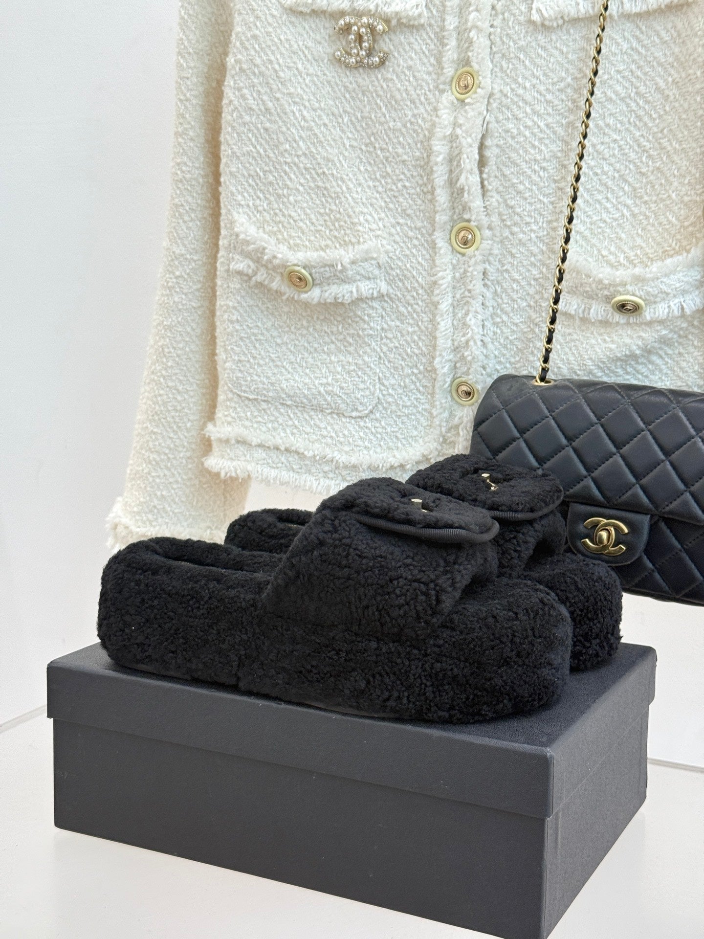 Chanel 25 Buckle Flip-up Thick-soled Slippers Black Wool 465386
