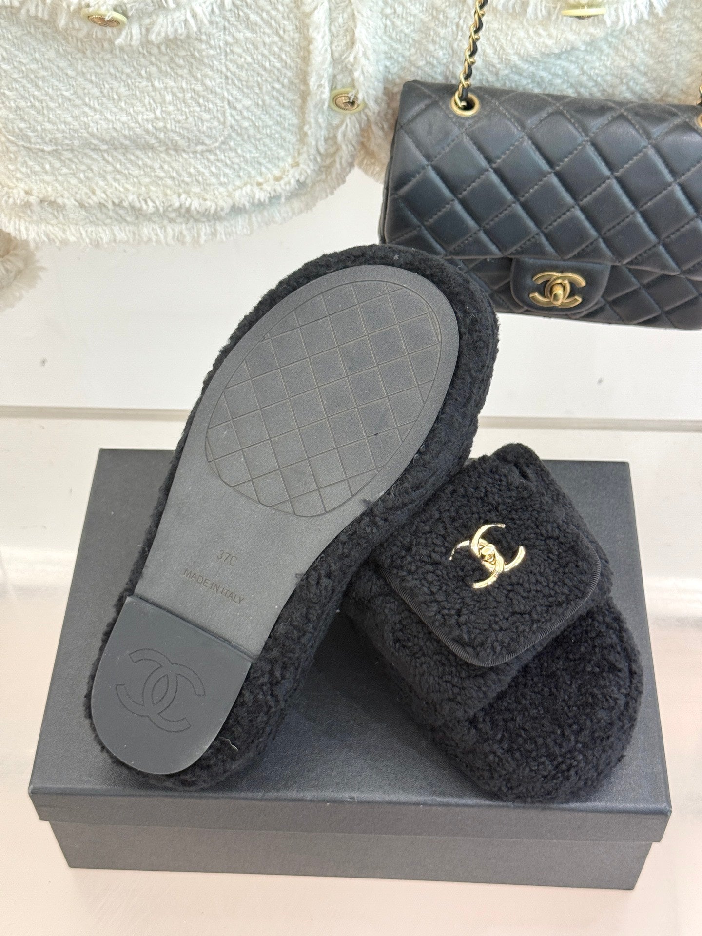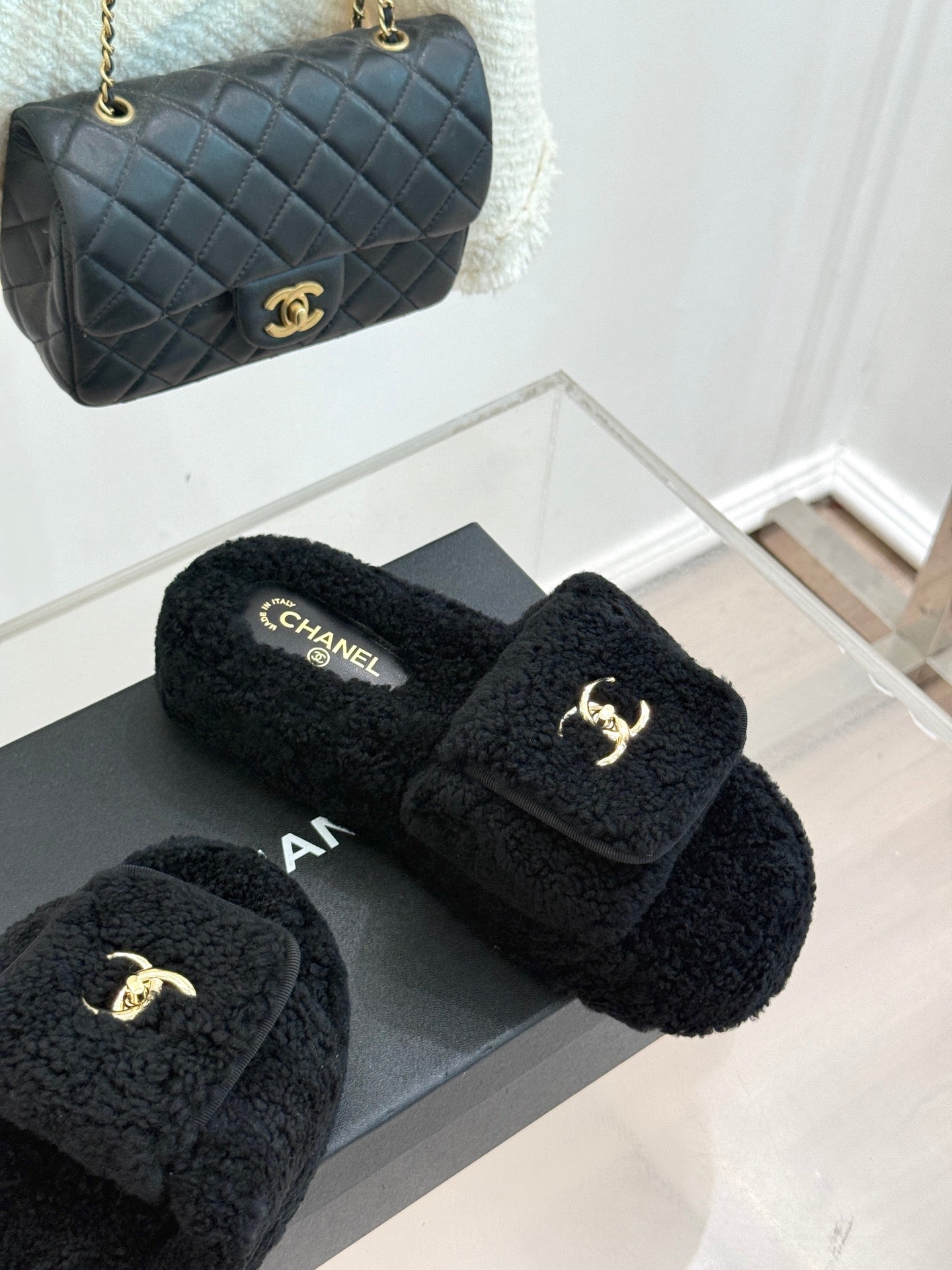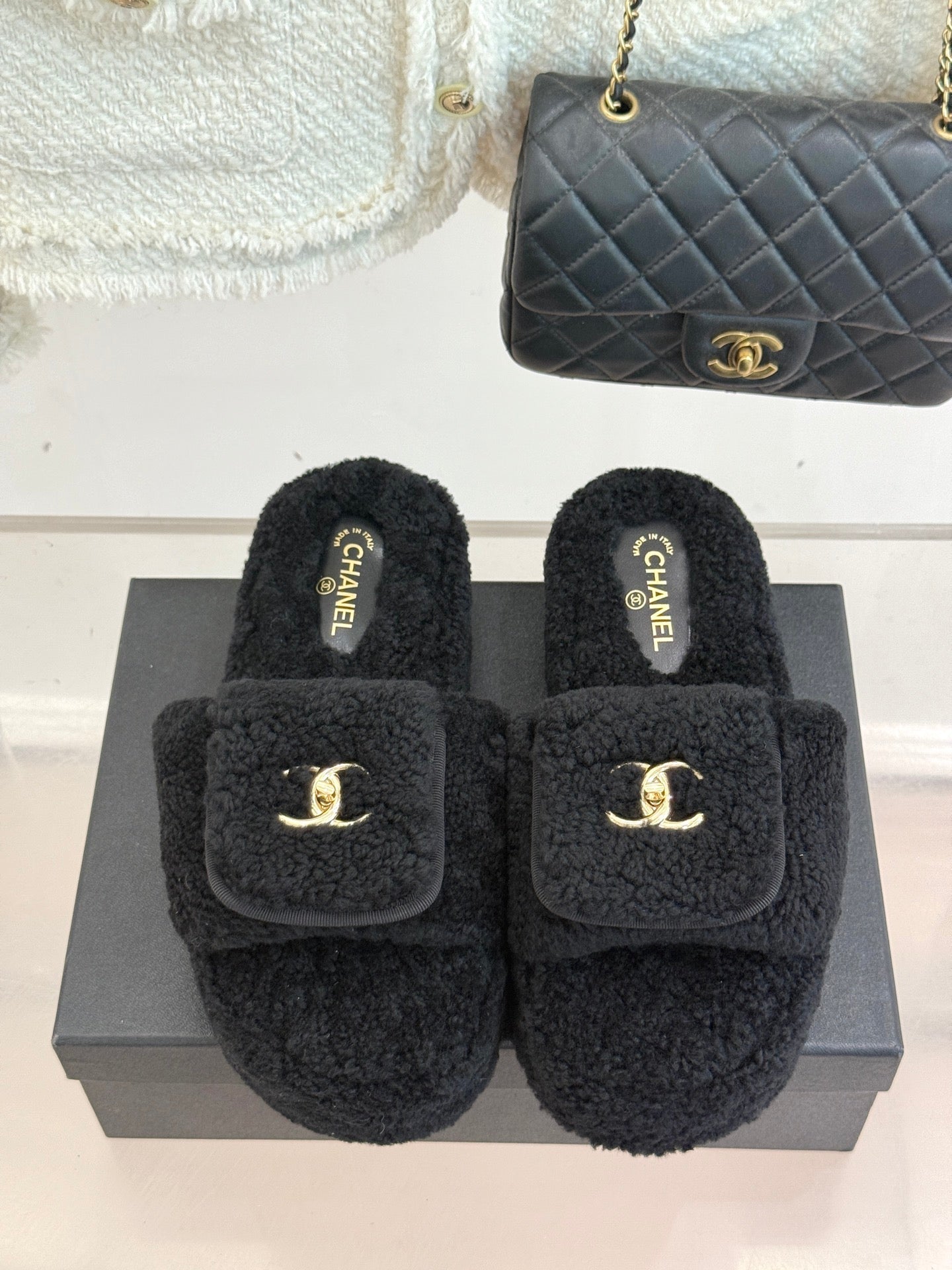 Chanel 25 Buckle Flip-up Thick-soled Slippers Black Wool 465386