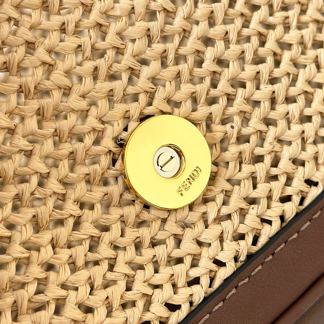 FENDI BAGUETTE 27 BAG IN BEIGE RAFFIA AND BROWN CALFSKIN WITH GOLD HARDWARE
