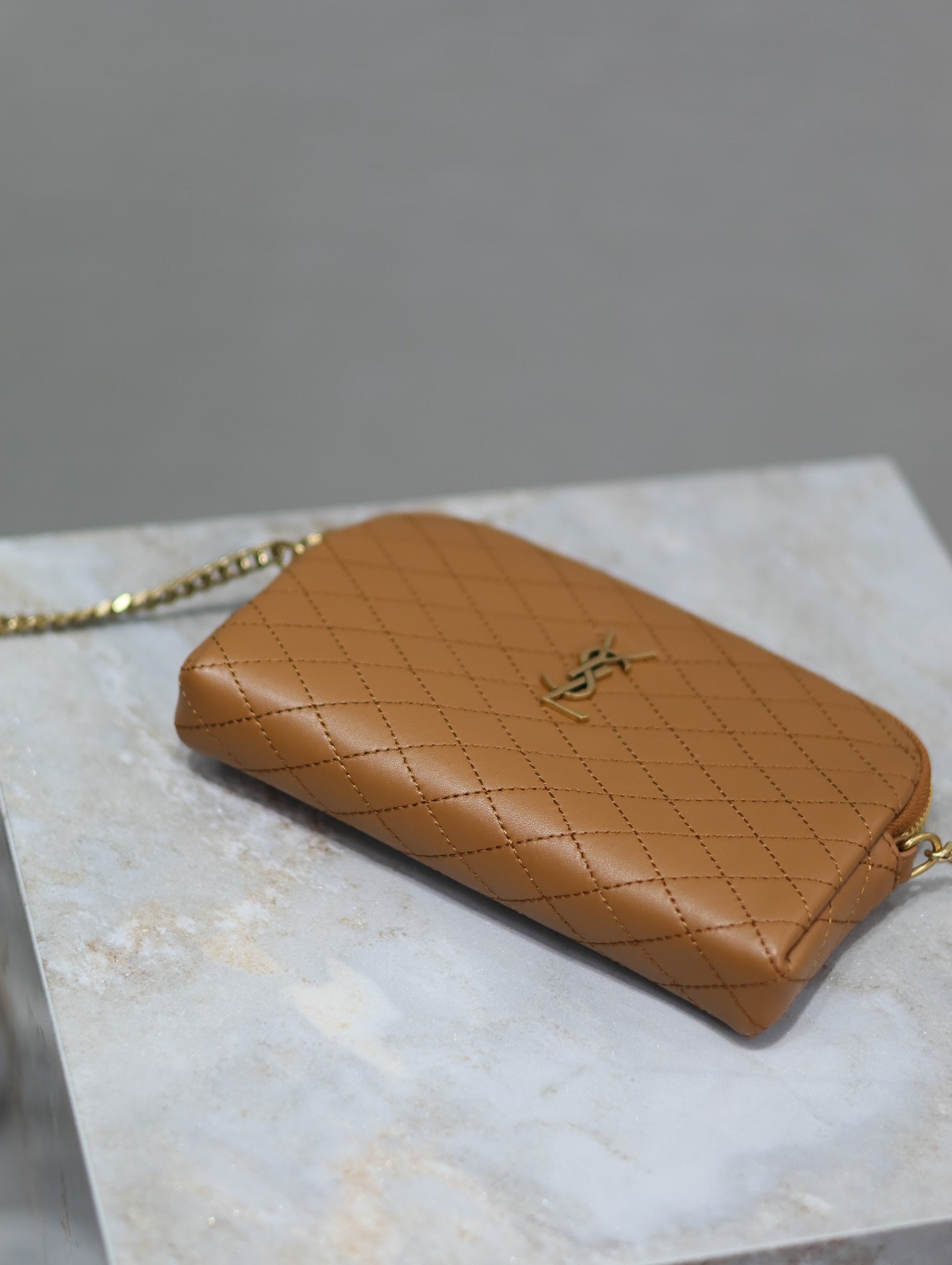 GABY ZIPPED POUCH 19 IN CARAMEL BROWN QUILTED LAMBSKIN GOLD HARDWARE