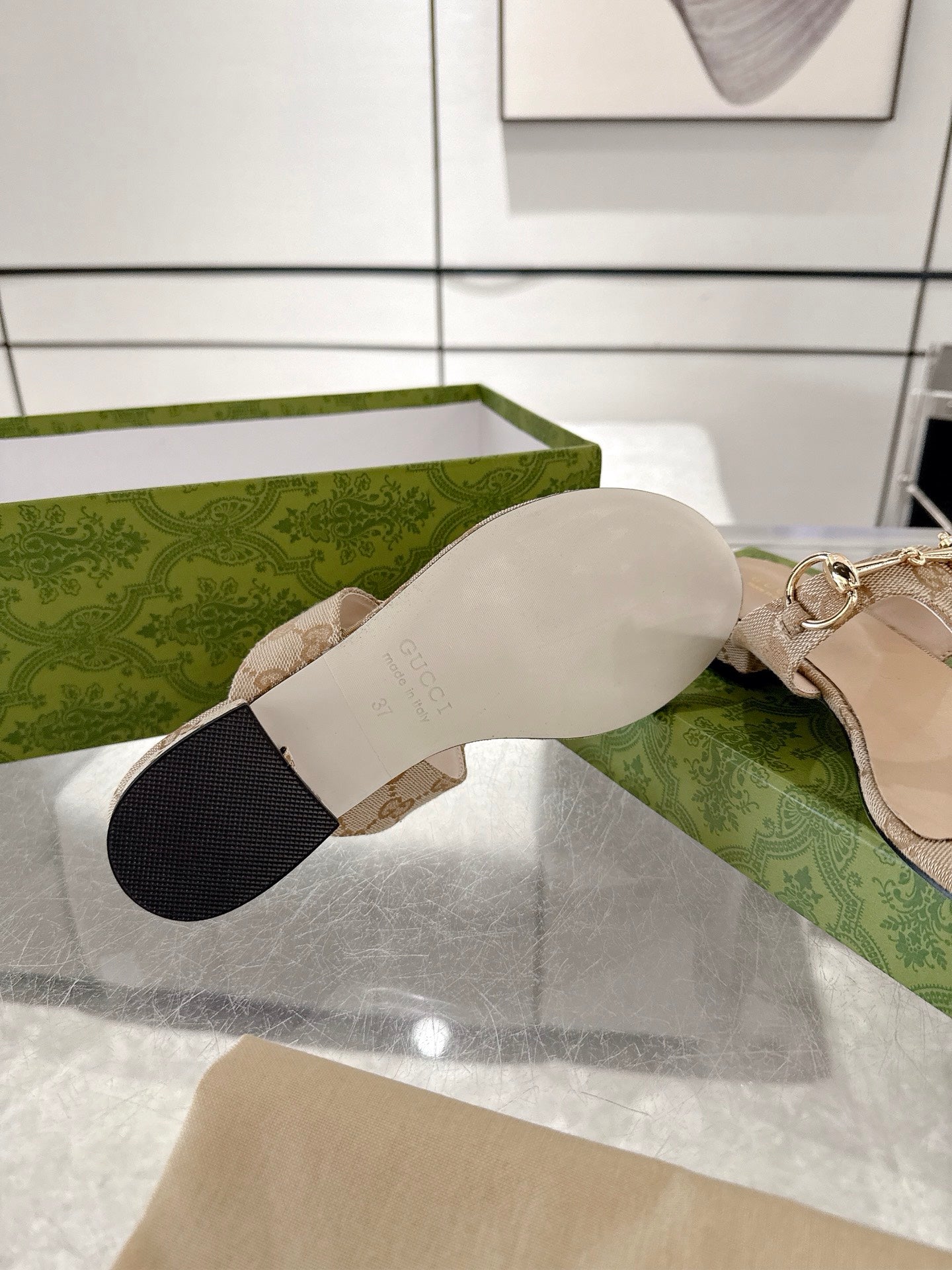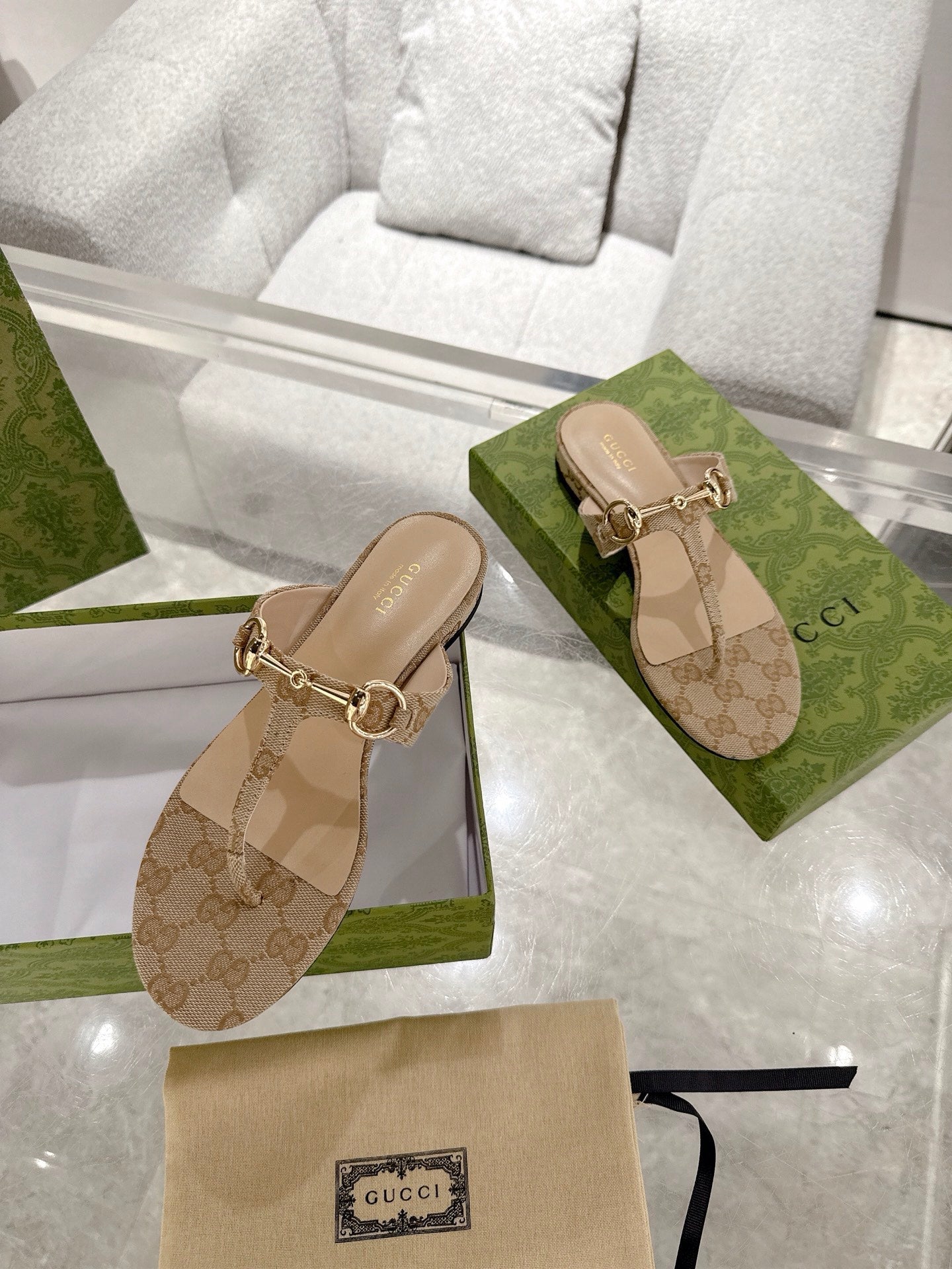 GC Horsebit Thong Sandals Beige Canvas Leather 292475
