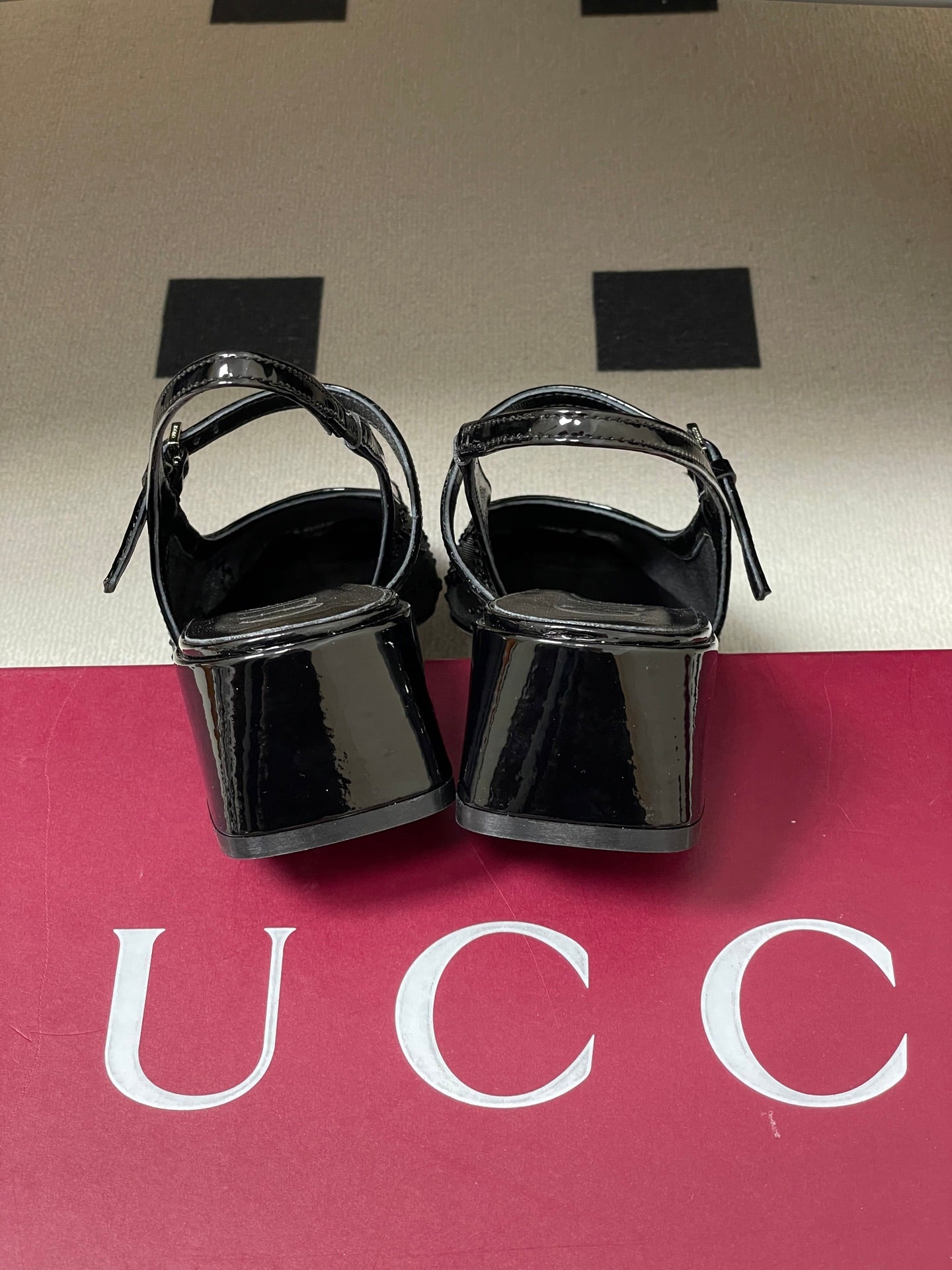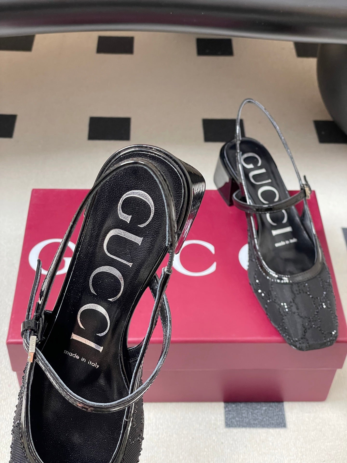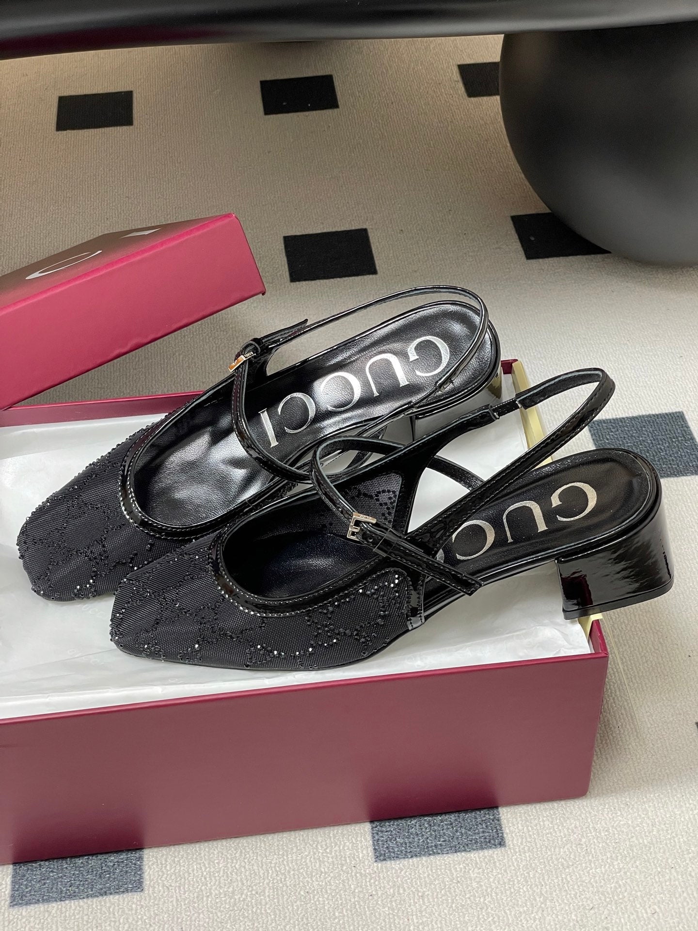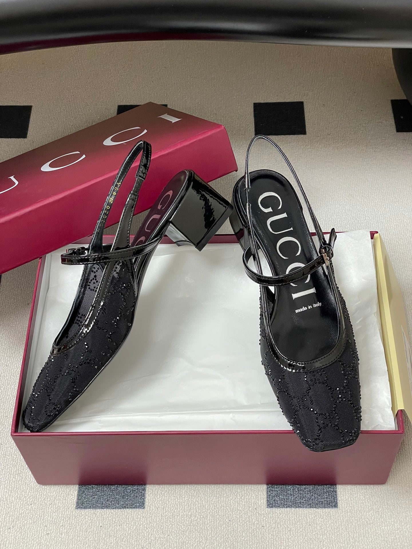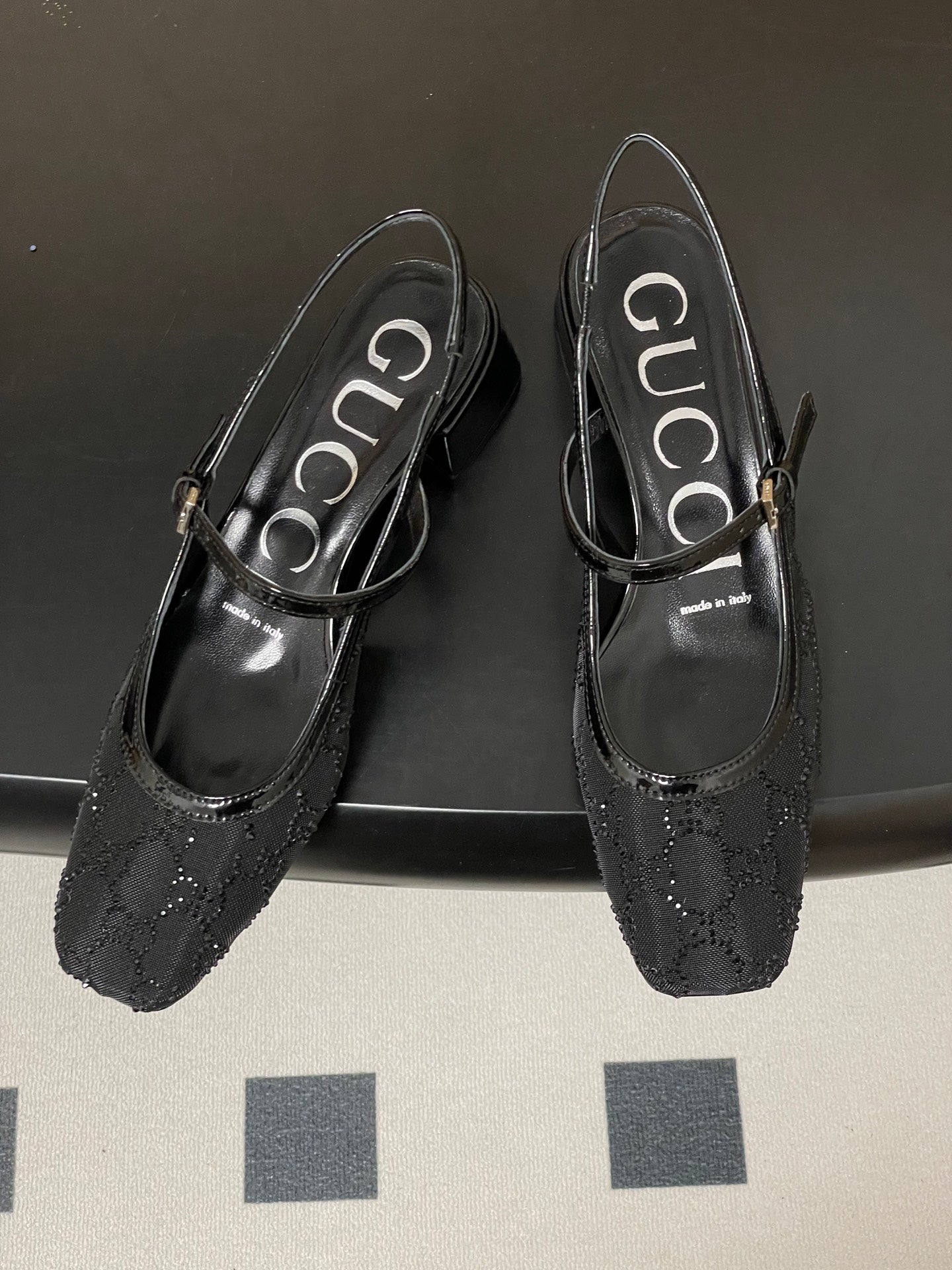GG 26ss Crystal Rhinestone Mary Jane Black Mesh Fabric 593511