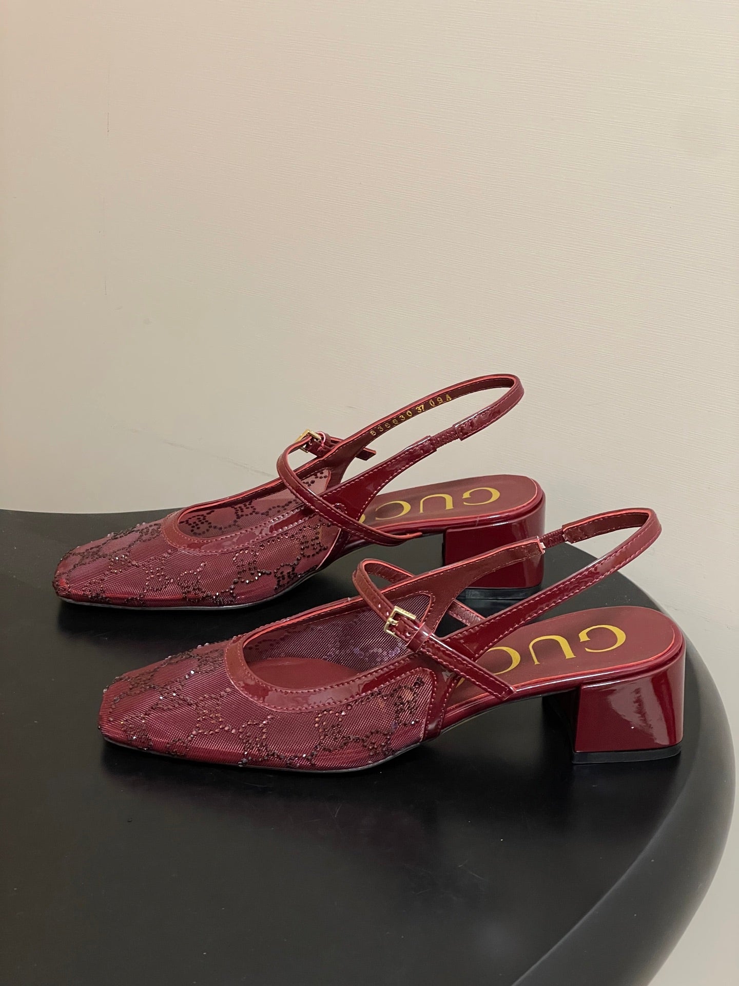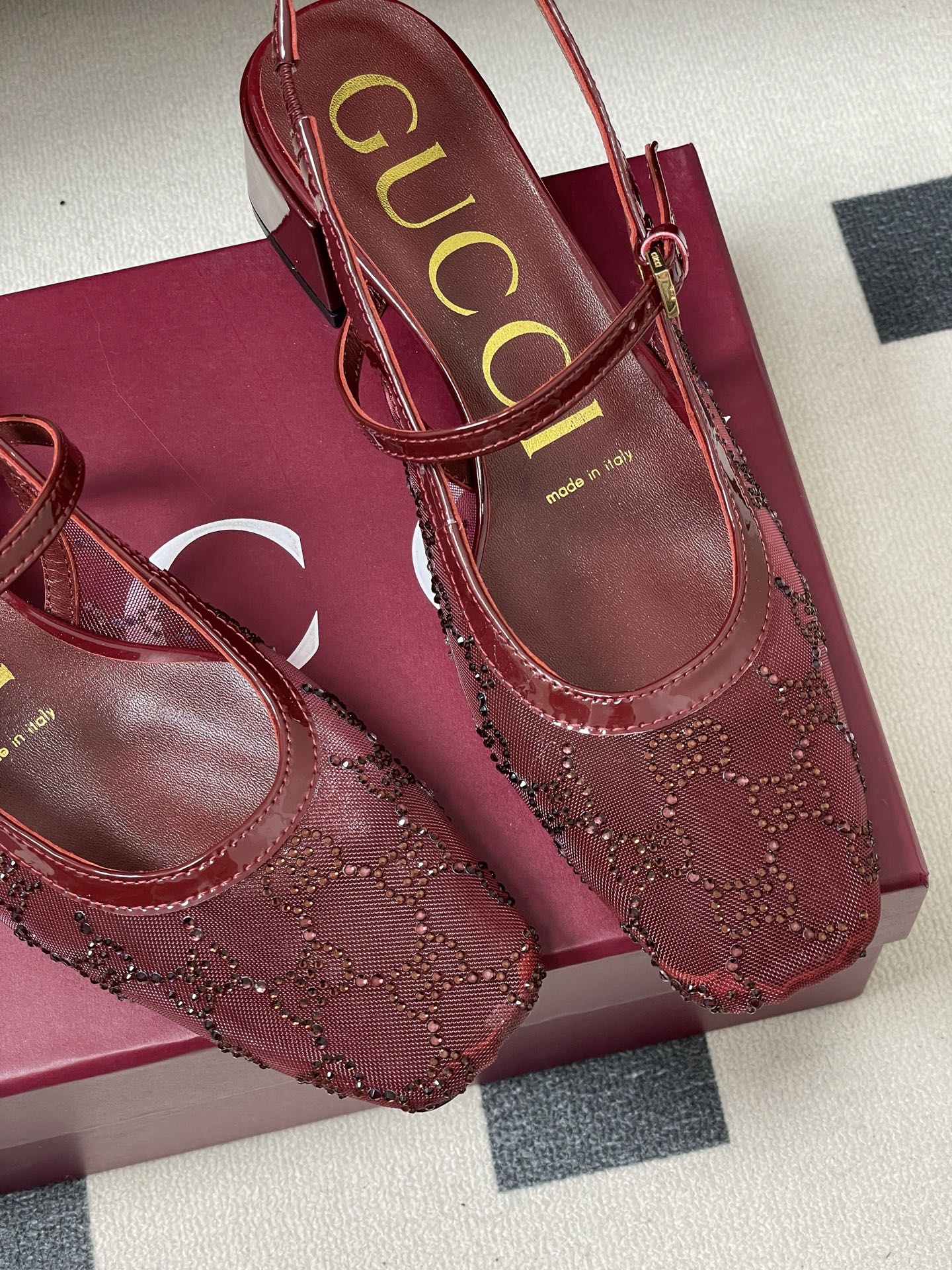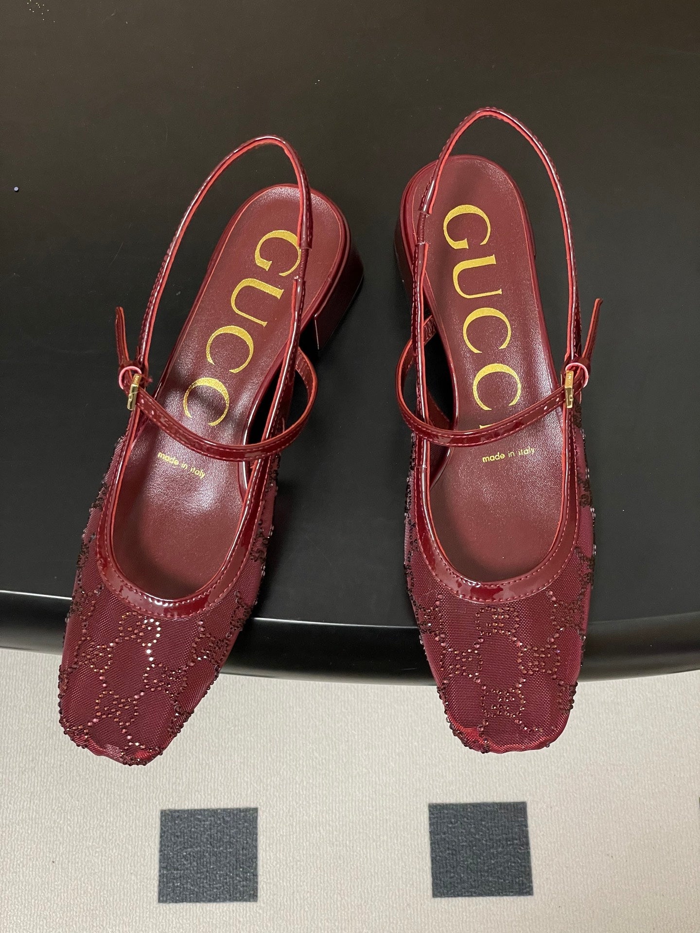 GG 26ss Crystal Rhinestone Mary Jane Red Mesh Fabric 593509