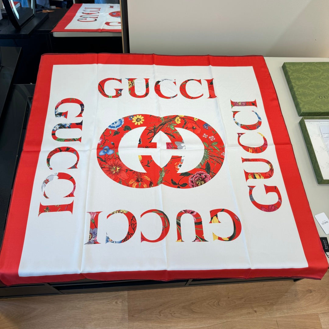 GG Signature Floral Scarf 90CM White Red Twill Silk 280694