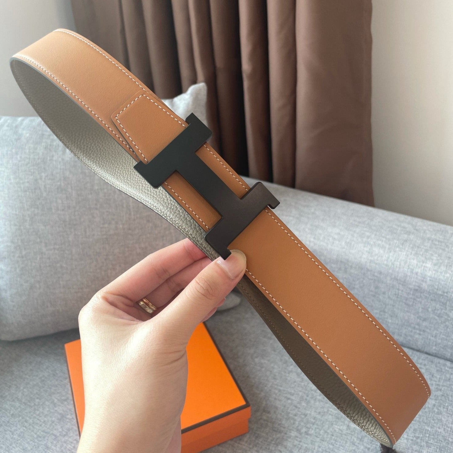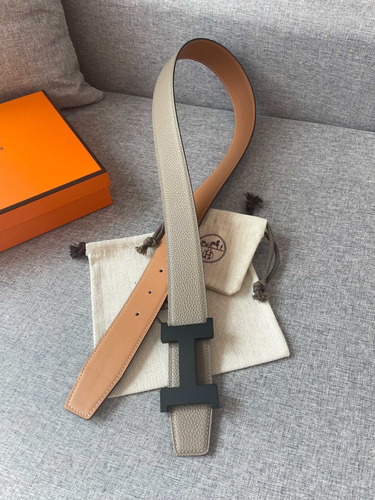 H CONSTANCE REVERSIBLE BELT 38MM BLACK BUCKLE GOLD TIN GREY LEATHER