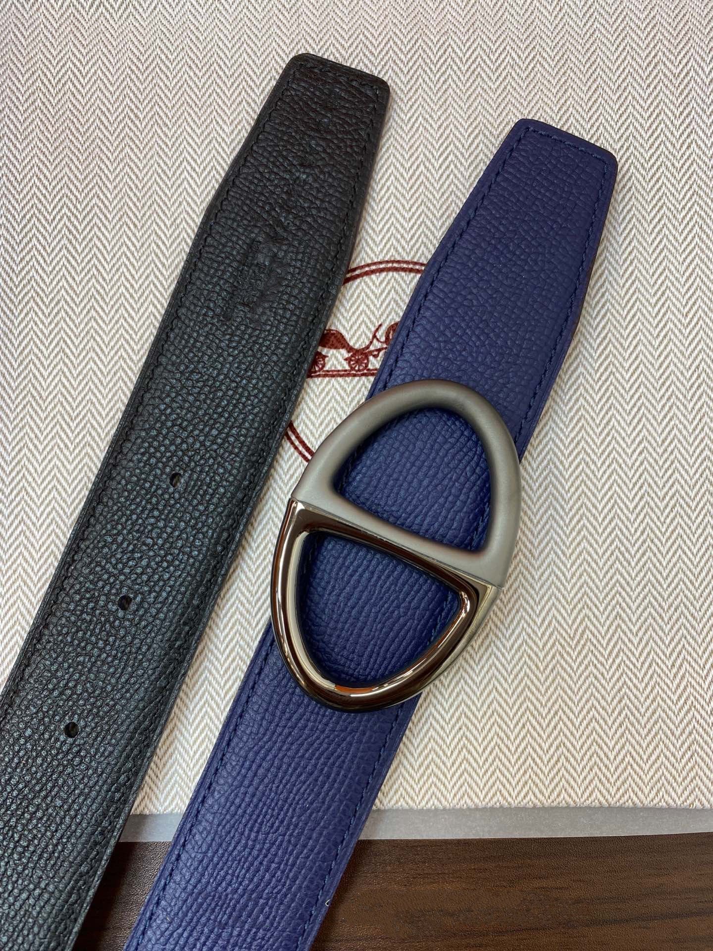 H TWIN REVERSIBLE BELT 32MM BLACK SILVER BUCKLE BLACK BLUE LEATHER