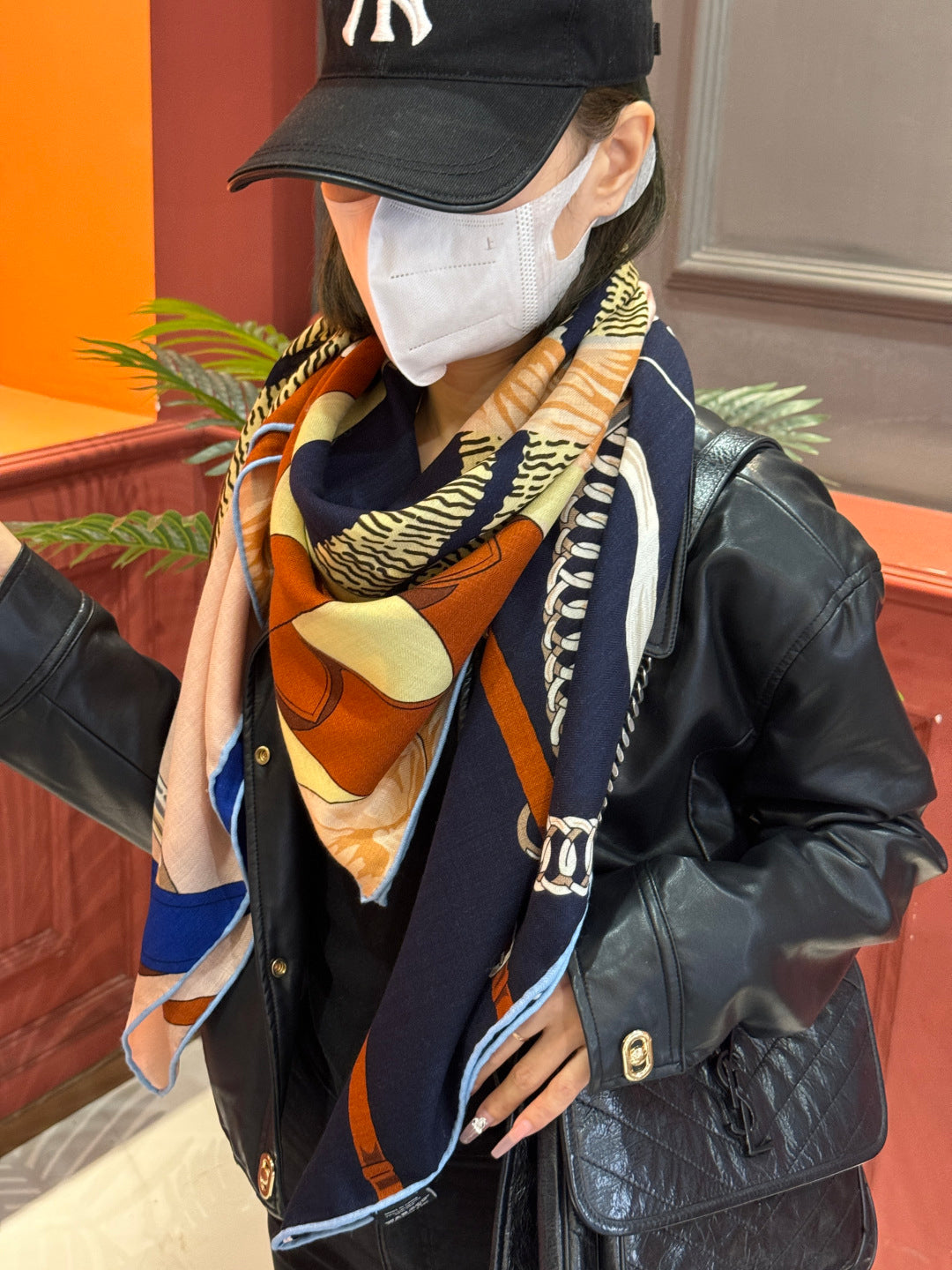 HM 25s Horse Reversible Scarf 140cm Blue Brown Cashmere Silk 967377