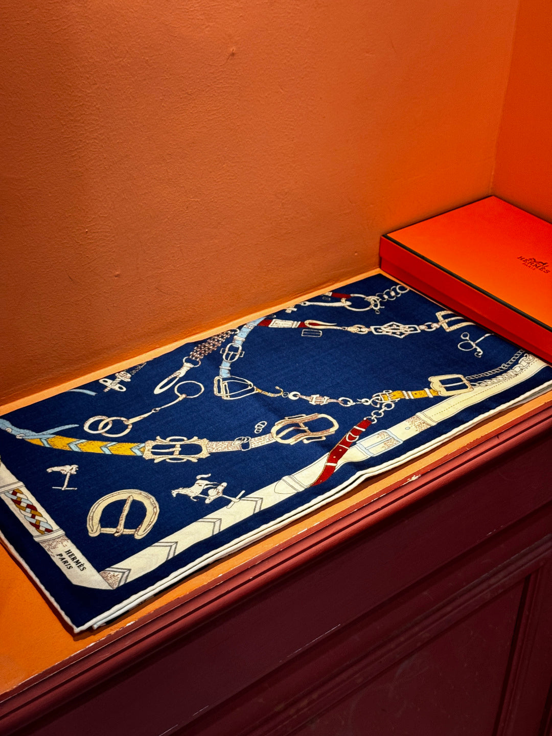 HM 25s Horse Reversible Scarf 140cm Blue Cashmere Silk 967390