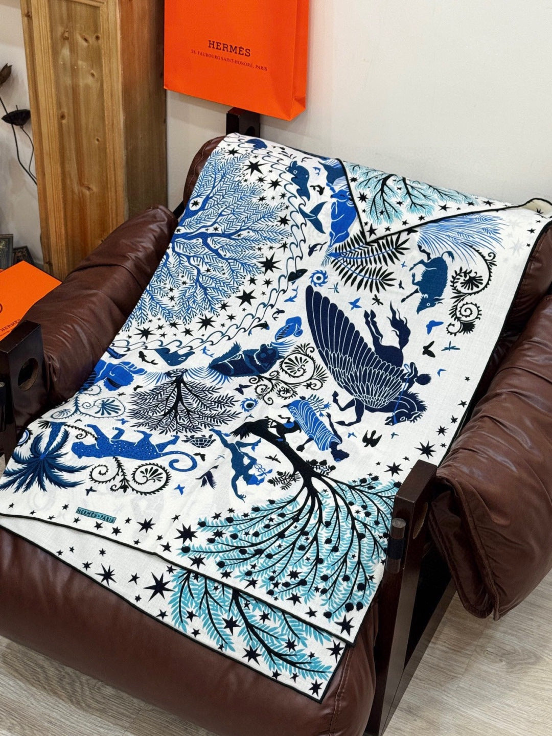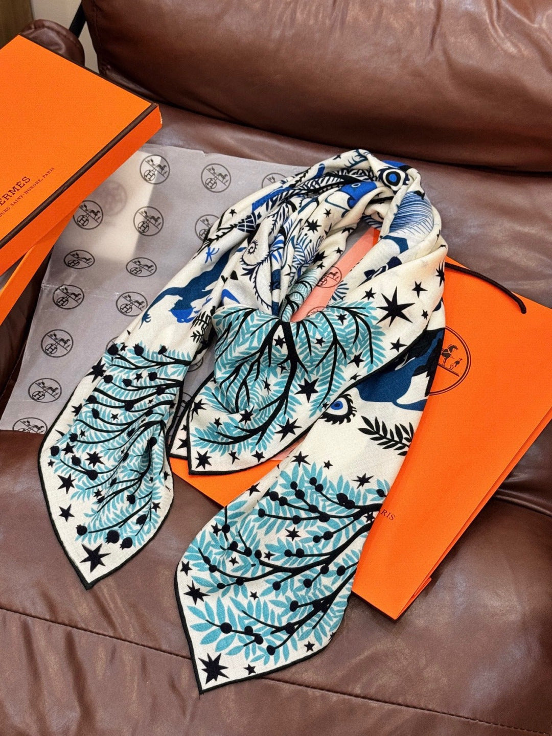 HM 25s Scarf 140cm White Blue Cashmere Silk 962468