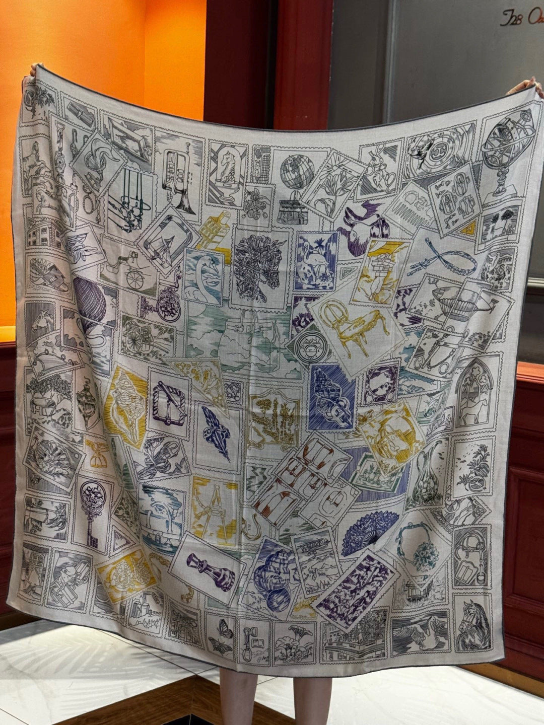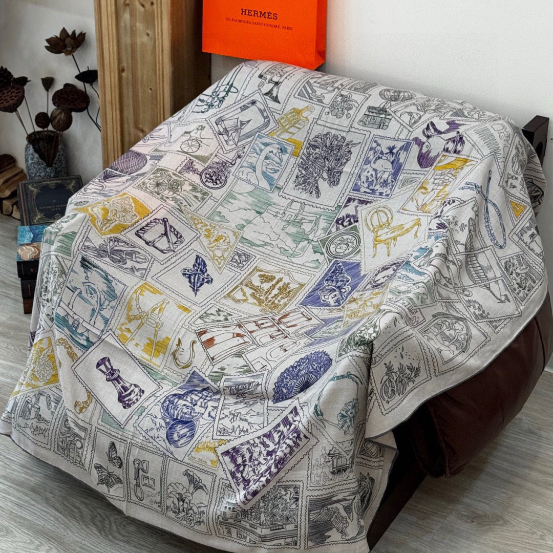 HM 25s Velvet Square Scarf 140cm Blue White Black Cashmere Silk 970939