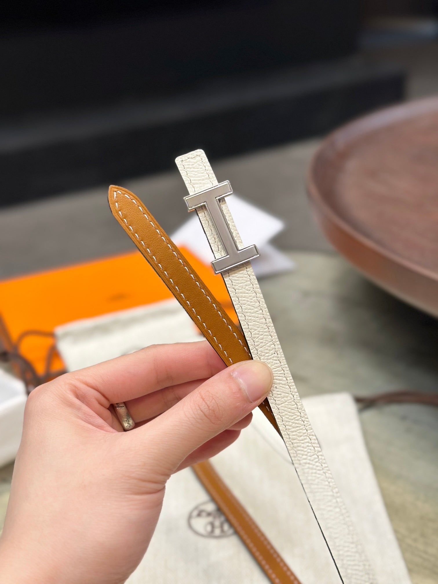 HM FOCUS BUCKLE & REVERSIBLE BRONZE BROWN AND WHITE LEATHER STRAP 13MM SILVER HARDWARE