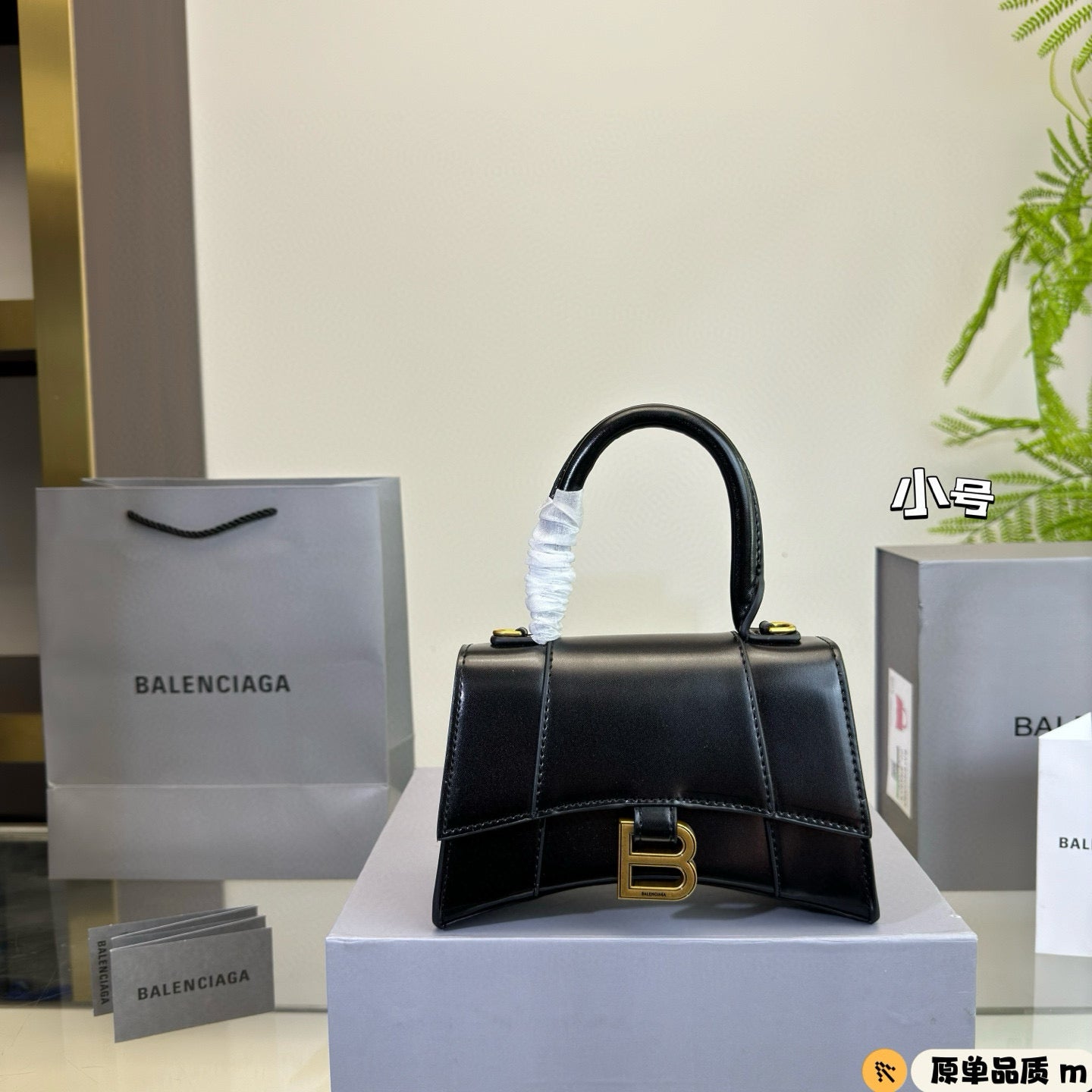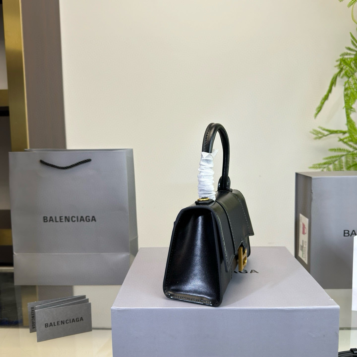 HOURGLASS HANDBAG 19 IN BLACK SHINY BOX CALFSKIN GOLD HARDWARE