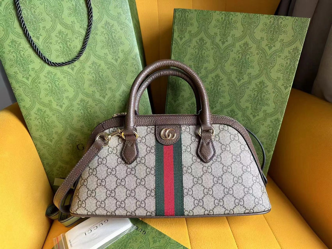 OPHIDIA 31 SMALL TOP HANDLE BAG IN BEIGE CANVAS AND BROWN CALFSKIN