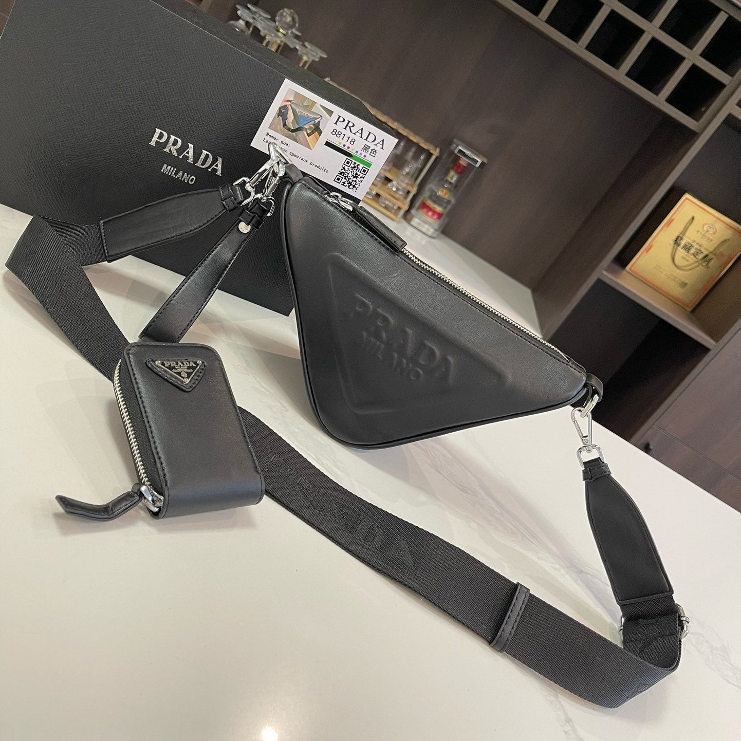 PRA TRIANGLE 27 SHOULDER BAG IN BLACK CALFSKIN WITH STRAP